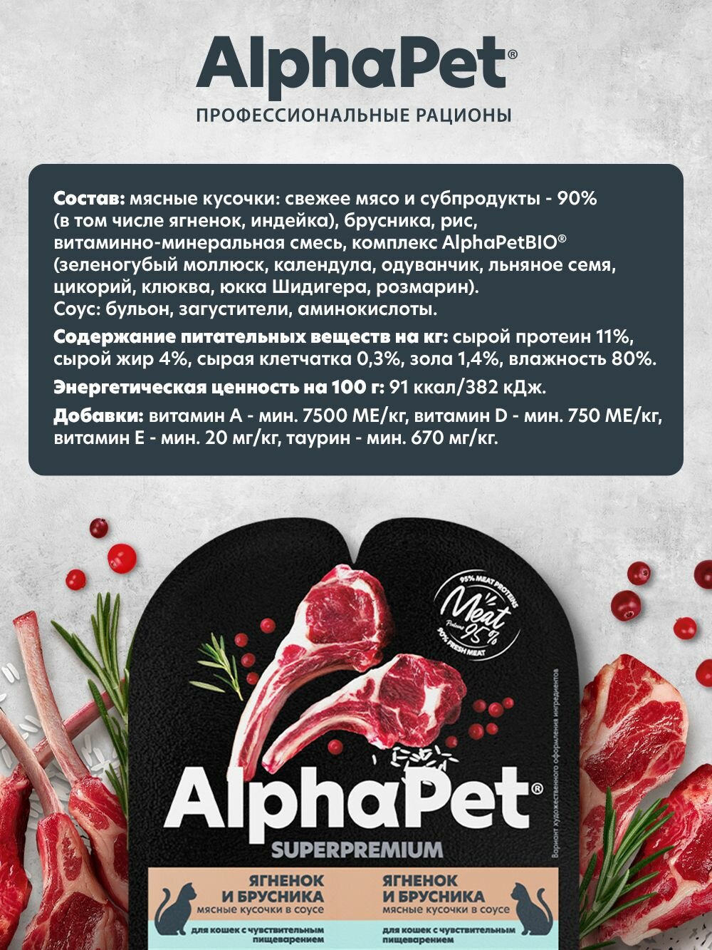 Влажный корм Alphapet Superpremium Альфа Пет для взрослых кошек с чувствительным пищеварением Ягненок и брусника в соусе (15 шт * 80 гр)