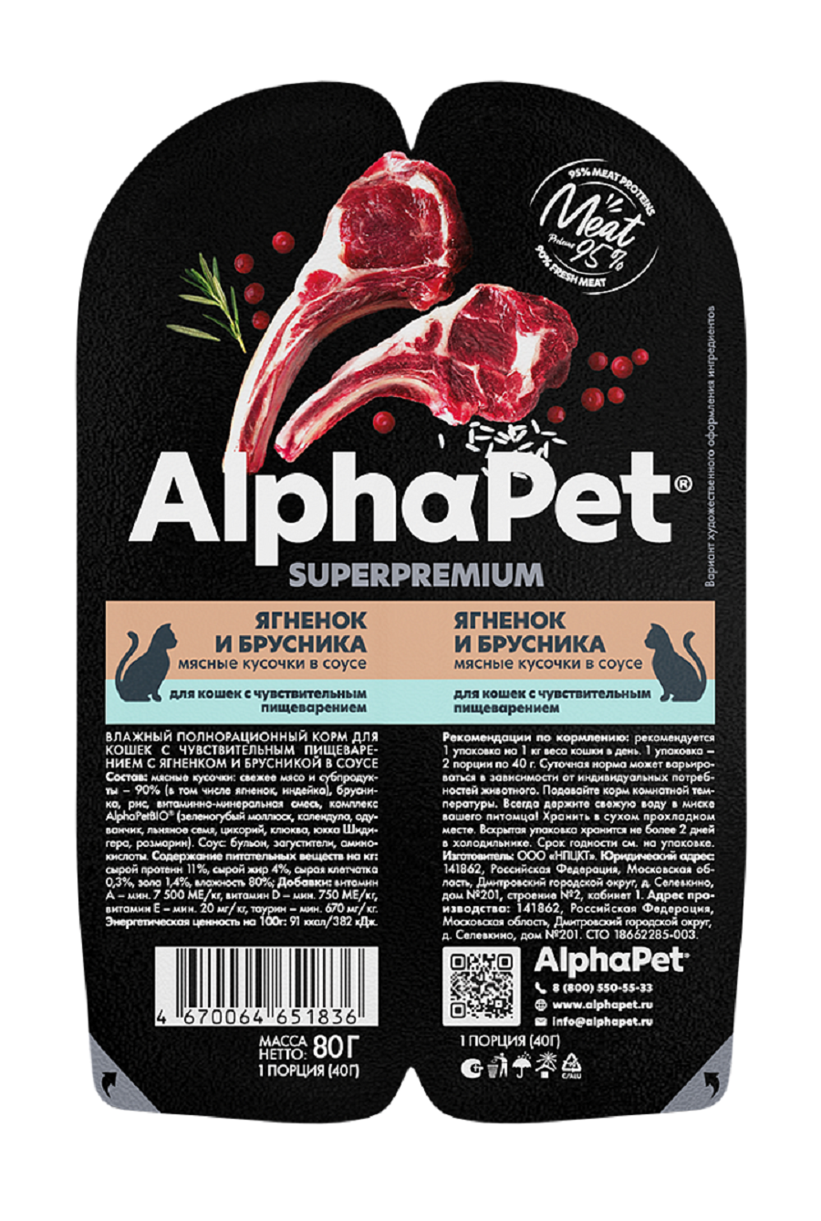 Влажный корм для кошек AlphaPet с чувствительным пищеварением, кусочки ягненка и брусники в соусе, 80г х 15шт