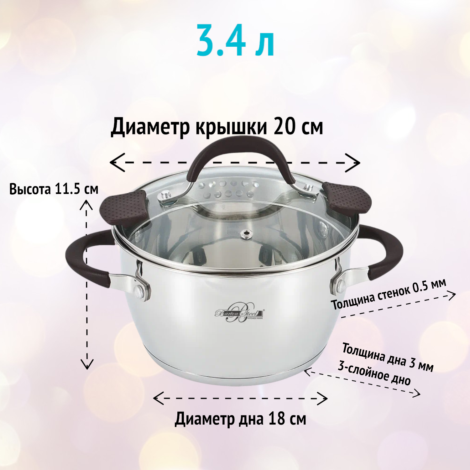 | Дополнительная информация | Общий объем кастрюли — 3.4 л, полезный (рабочий) объем — 3.1 л |