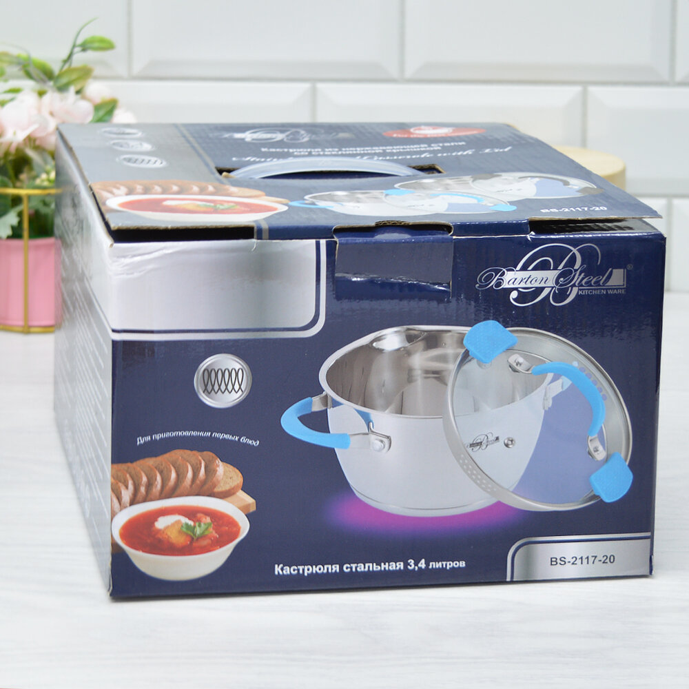 Кастрюля 3.4 л из нержавеющей стали со сливом в крышке Barton Steel BS 2117-20 BL, голубая ручка