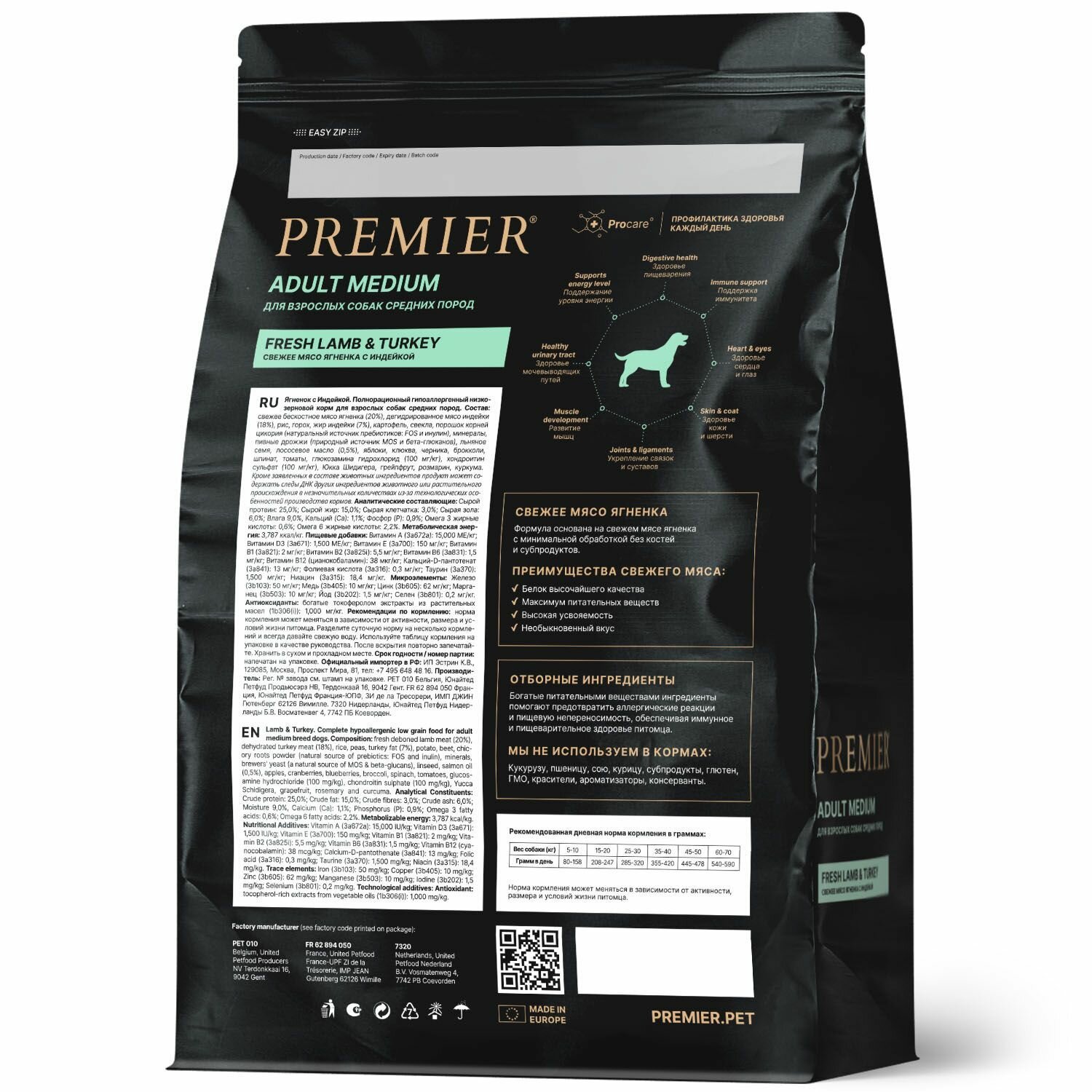 Premier Dog Lamb & Turkey Adult Medium сухой корм для собак средних пород, свежее мясо ягненка с индейкой - 3 кг