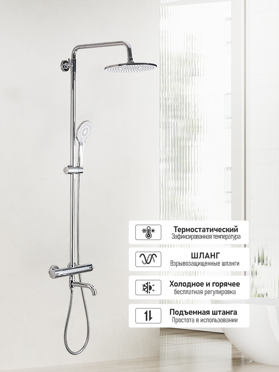| Плюсы: | Отличная модель душевой системы с термостатическим смесителем. За счет поворачиваемого крана, подходит в компактные душевые. |