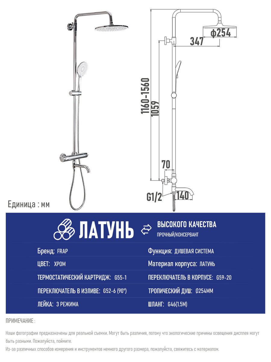 Душевая система с тропическим душем термостатом латунь тропический душ Frap F24007 хром