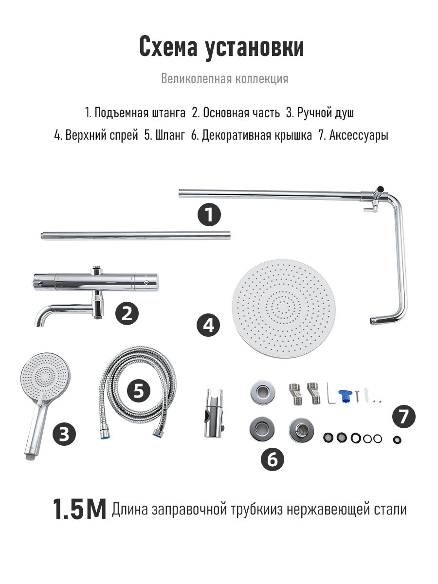 | Комплектация | верхний душ / держатель лейки / излив для набора воды / кронштейн / лейка / шланг |