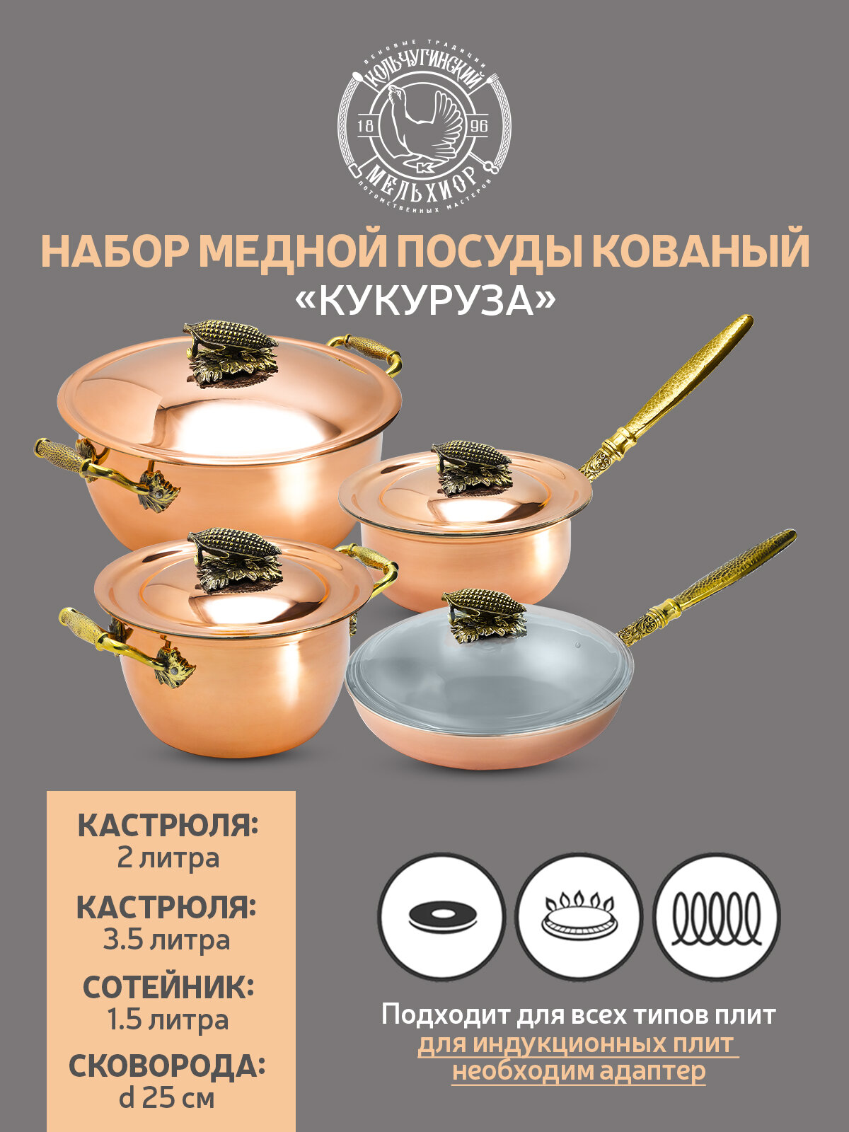 Набор посуды медной "Кукуруза" 4 предмета (кастрюля 2 л, кастрюля 3,5 л, сотейник, сковорода) в коробе интересное: