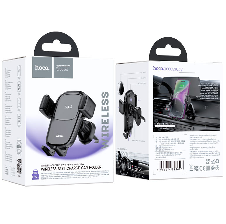 Держатель автомобильный на решетку с беспроводной зарядкой автоматический, HW1 Pro, HOCO, черный