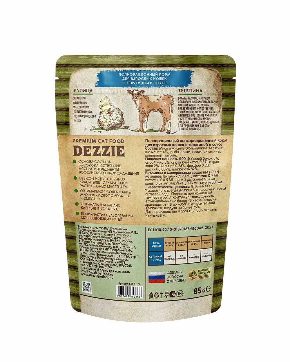 Корм для кошек влажный DEZZIE ADULT CAT (пауч) 12шт - 85г, Телятина в соусе интересное: