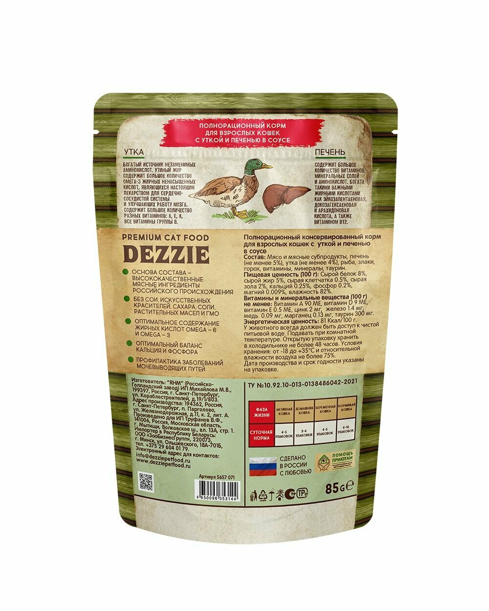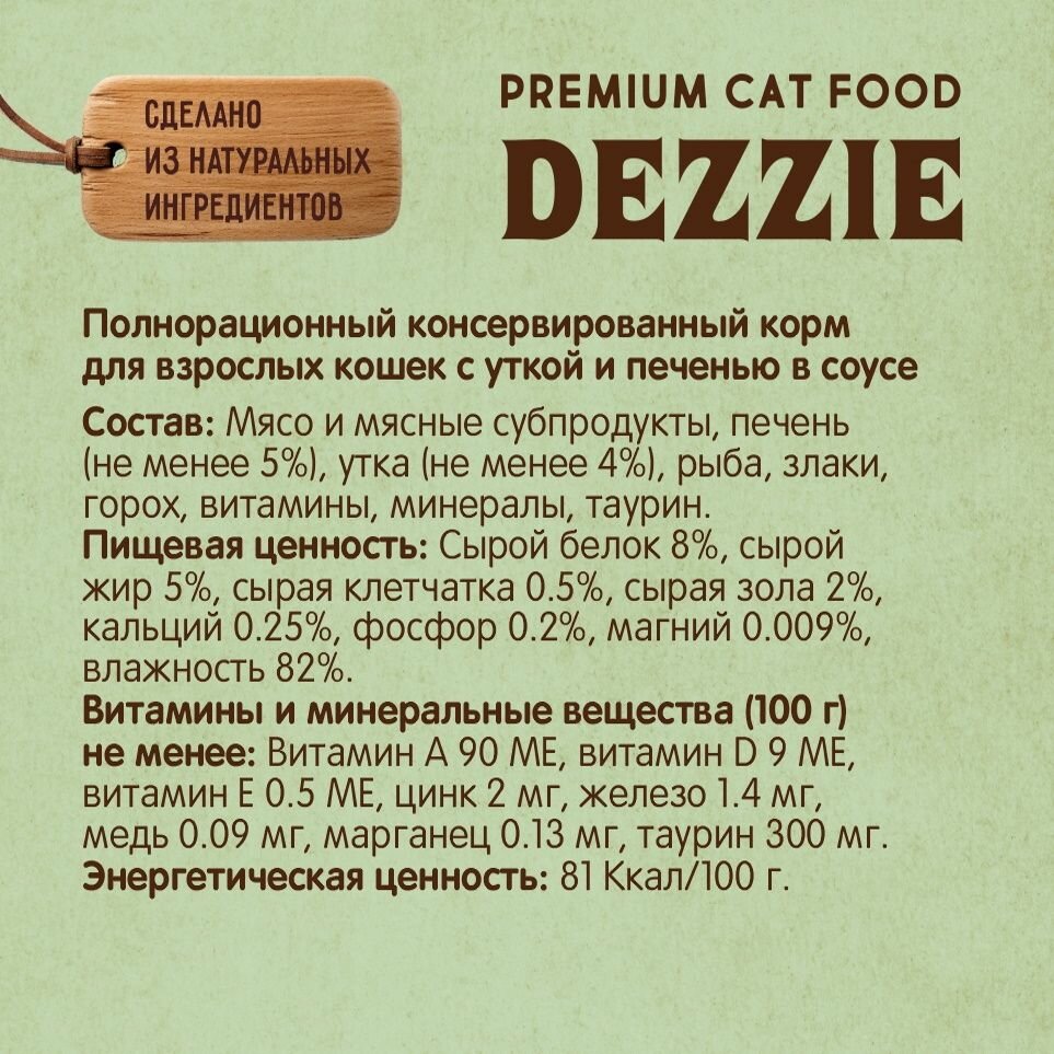 Корм для кошек влажный DEZZIE ADULT CAT (пауч) 12шт - 85г, Утка и печень в соусе интересное: