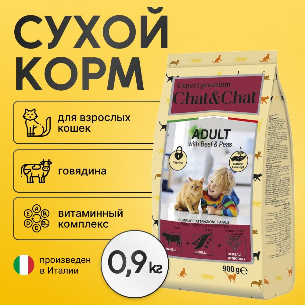 Сухой корм Chat&Chat Expert Premium для взрослых кошек с говядиной и горохом 900 гр