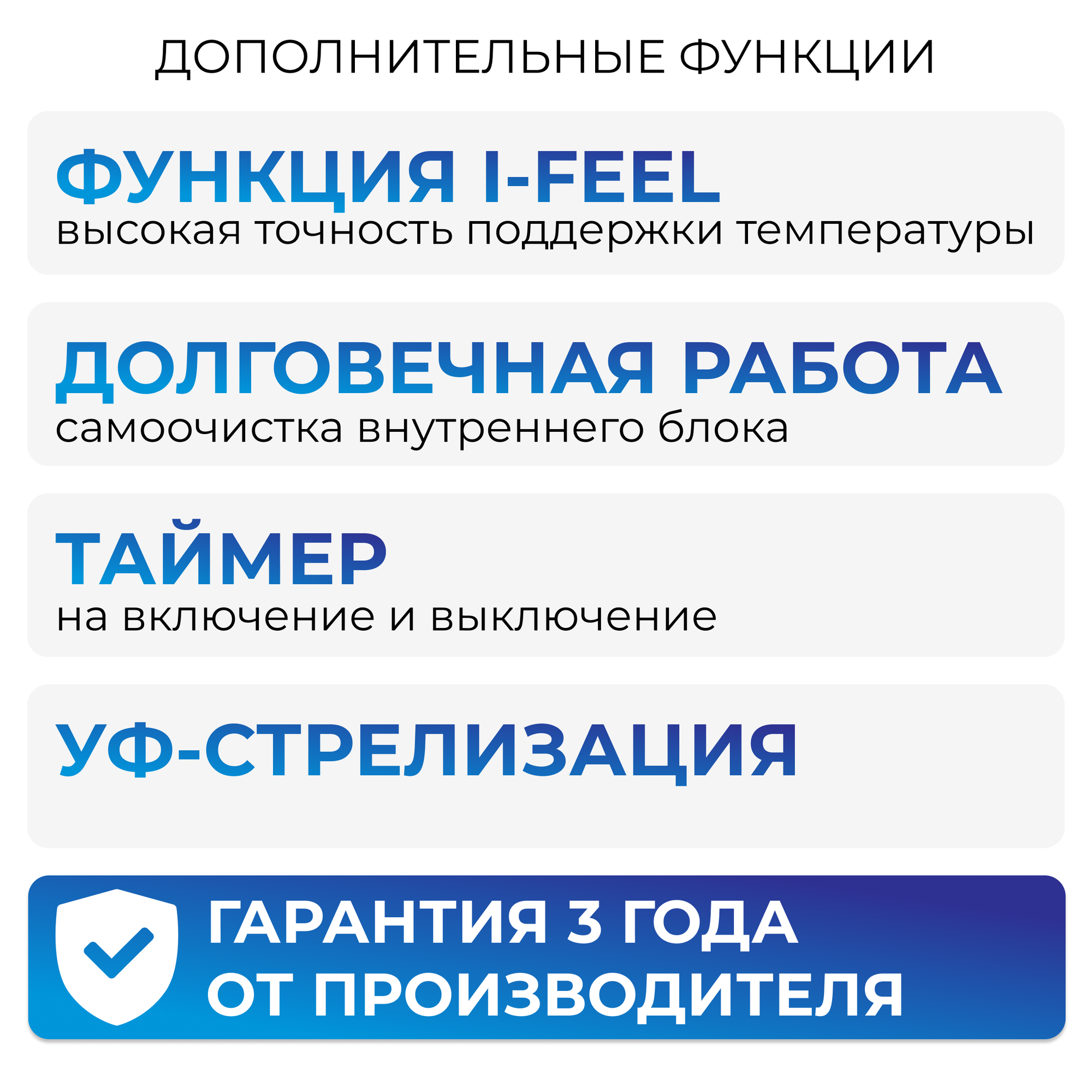 | Дополнительные функции | автоматическое поддержание температуры / автоперезапуск / самодиагностика / самоочистка внутреннего блока |