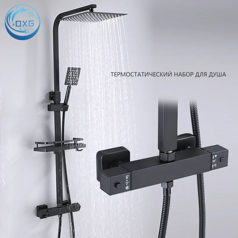 Душевая стойка с термостатом и тропическим душем черная с металлическими лейками интересное: