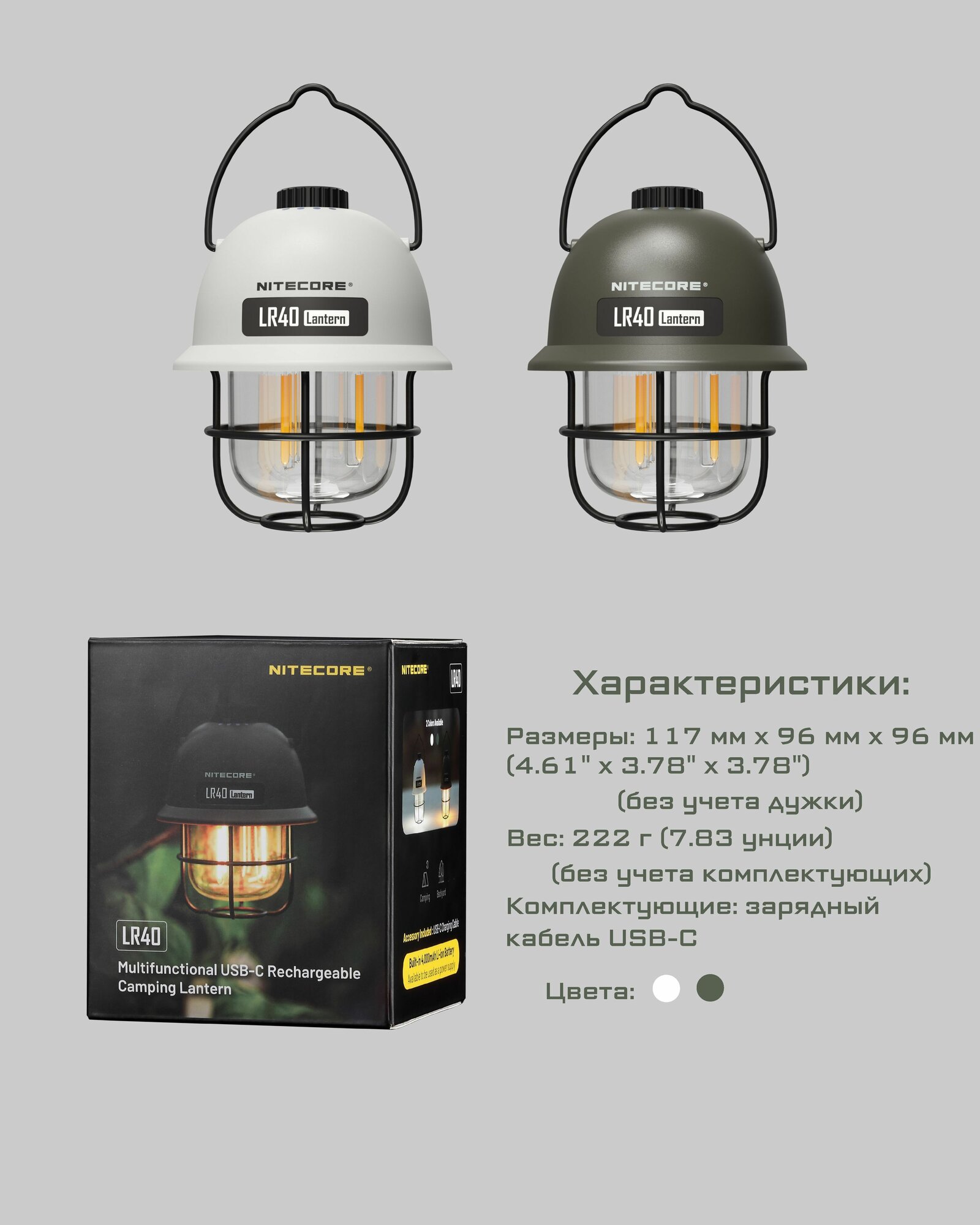 Кемпинговый ретро фонарь NiteCore LR40 белый 100 лм с нейтральным и теплым светом Плавная регулировка яркости