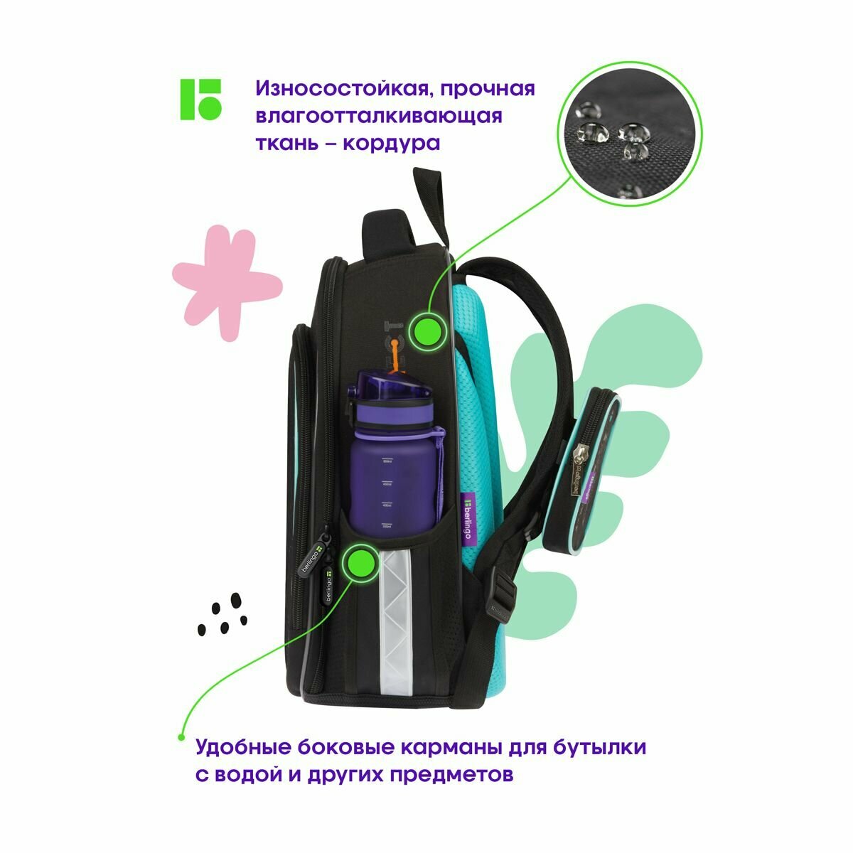 | Особенности | вентилируемая спинка / вентилируемые лямки / водоотталкивающая пропитка / карабин для ключей / ножки / ортопедический / регулируемые лямки / светоотражающие элементы / эргономичная спинка |