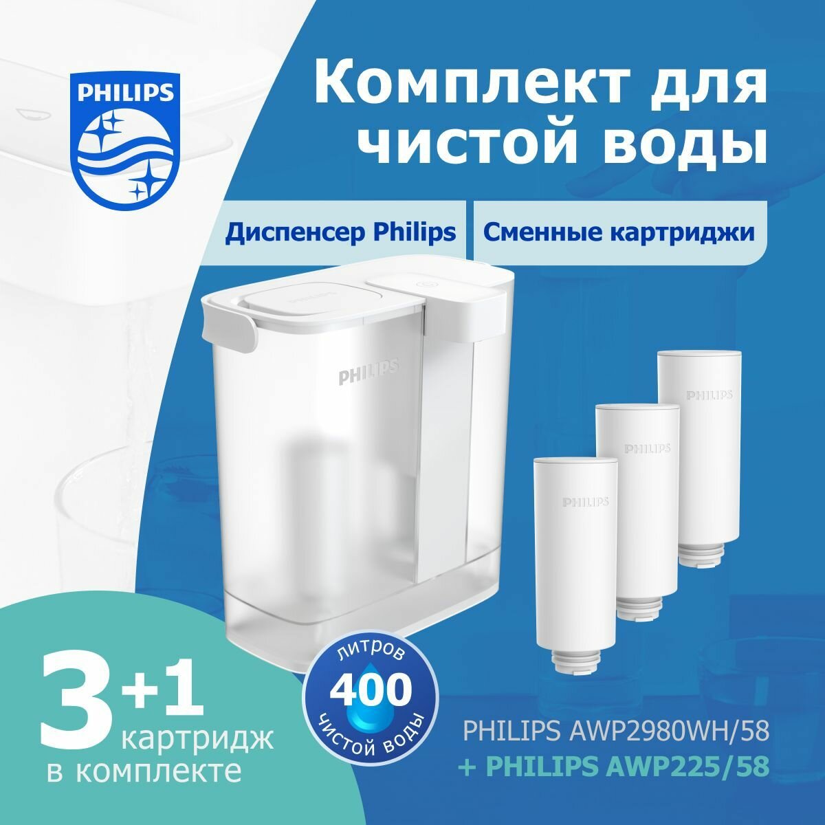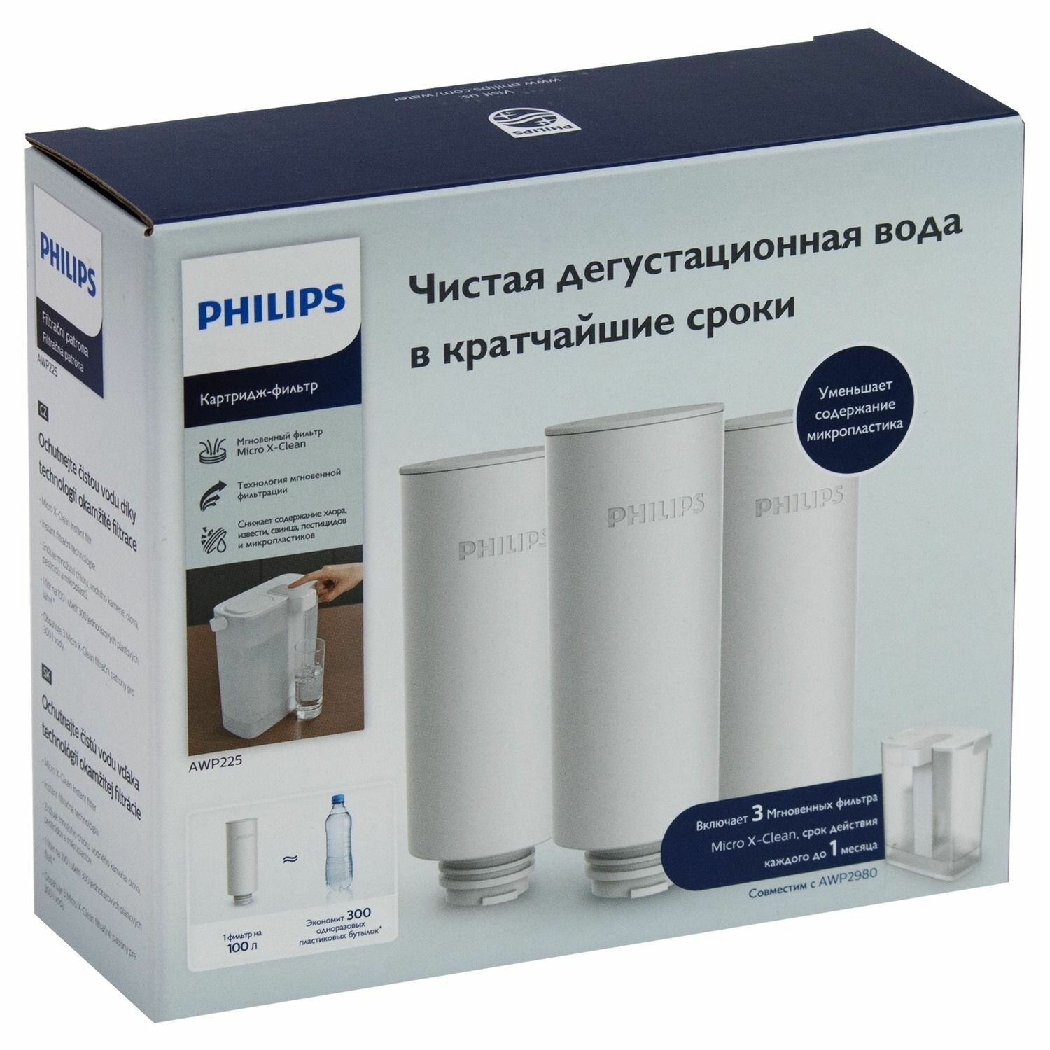 Купить Комплект фильтр-диспенсер для очистки воды Philips AWP2980WH (с картриджем), 3л+дополнительные сменные картриджи Philips AWP225, 3шт; очищает и придает свежий вкус воде