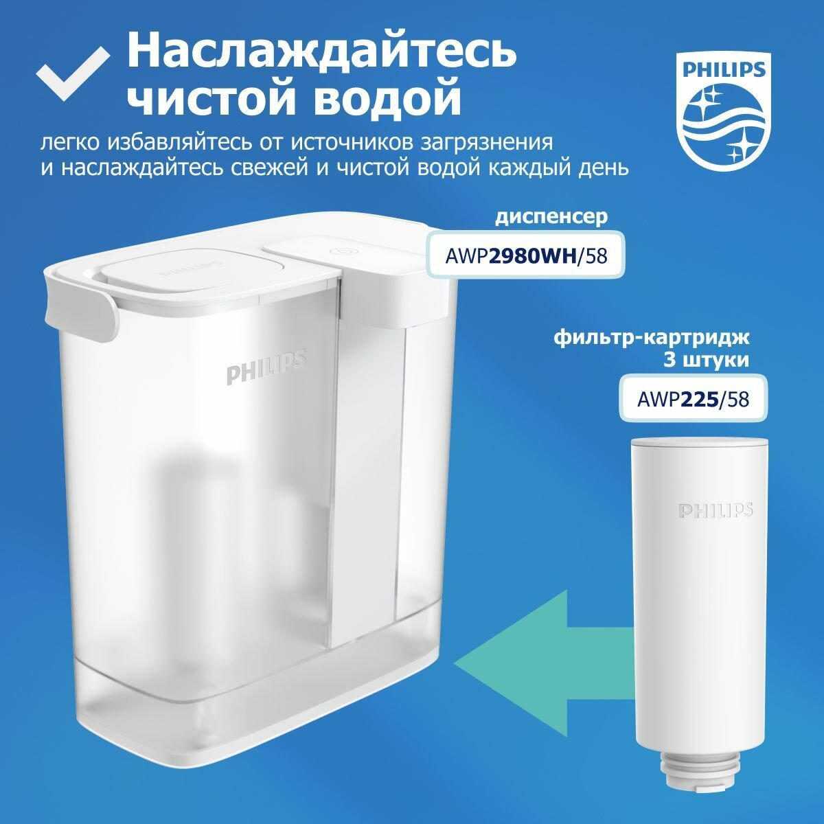Фильтр-диспенсер для воды Philips AWP2980WH/58, 3 л, сменные картриджи Philips AWP225/58, 3шт.