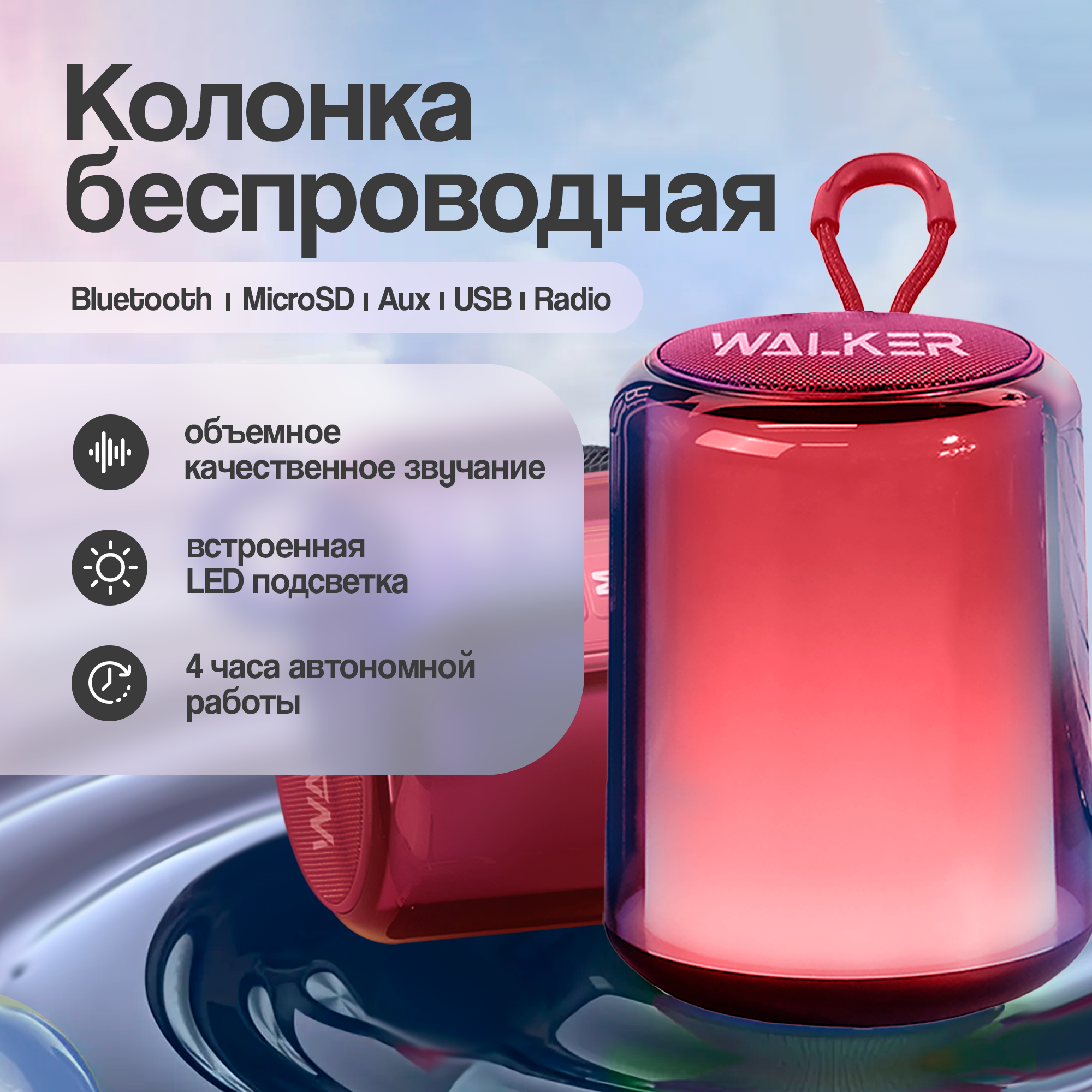 СохранитьПортативная колонка, WALKER, WSP-125, 5Вт, RGB-подсветка, TWS, Bluetooth 5.3, колонка блютуз, колонка jbl, jbl колонка, bluetooth колонка, красная интересное: