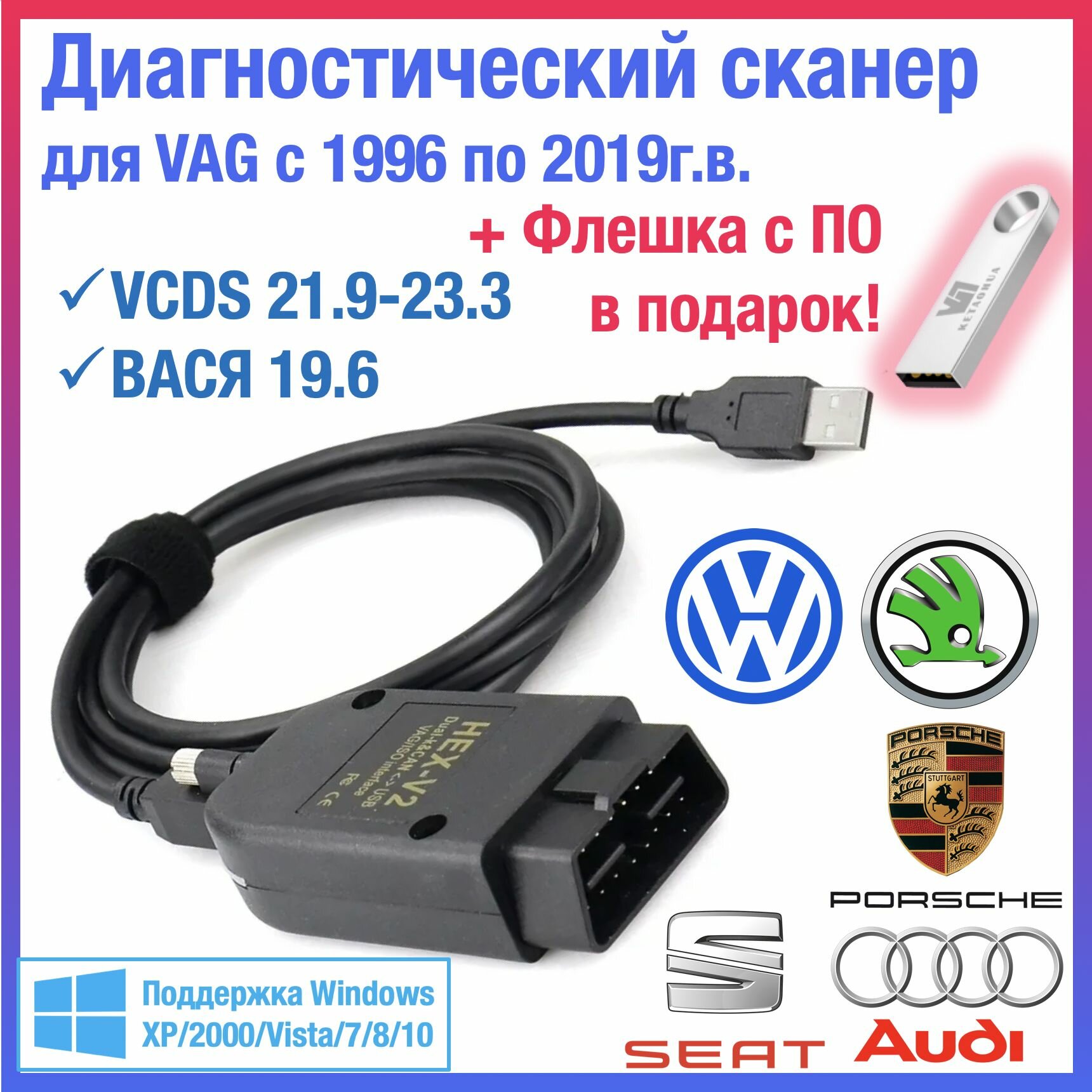 Диагностический сканер для VCDS и Вася диагност, VAG-COM для Volkswagen/Skoda/Audi c 1998 по 2019 г.в., VAGCOM HEX V2 OBD2 оригинальный чип ATMEGA162