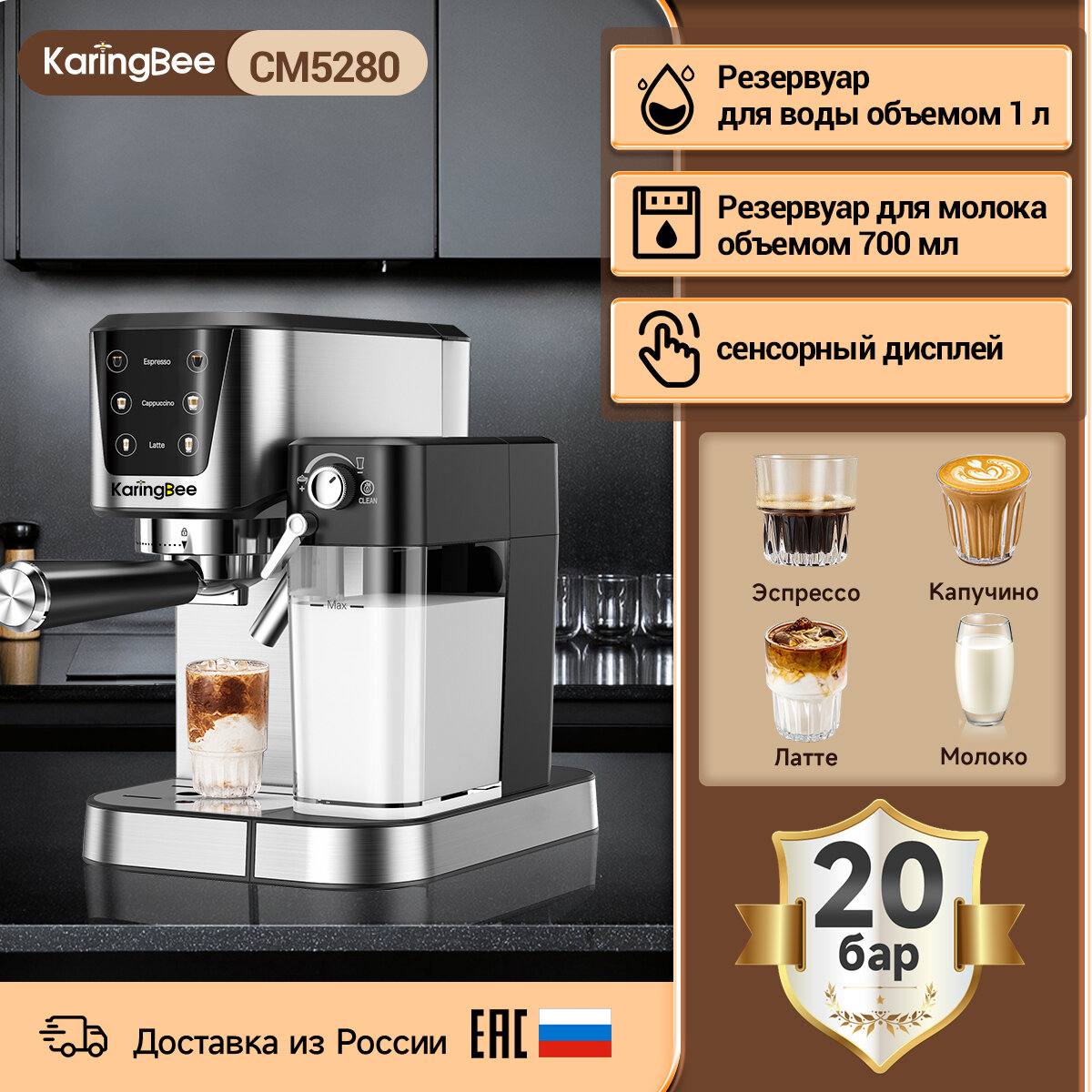 Купить Полуавтоматическая кофемашина KaringBee CM5280 с цветным сенсорным дисплеем, серебристого цвета