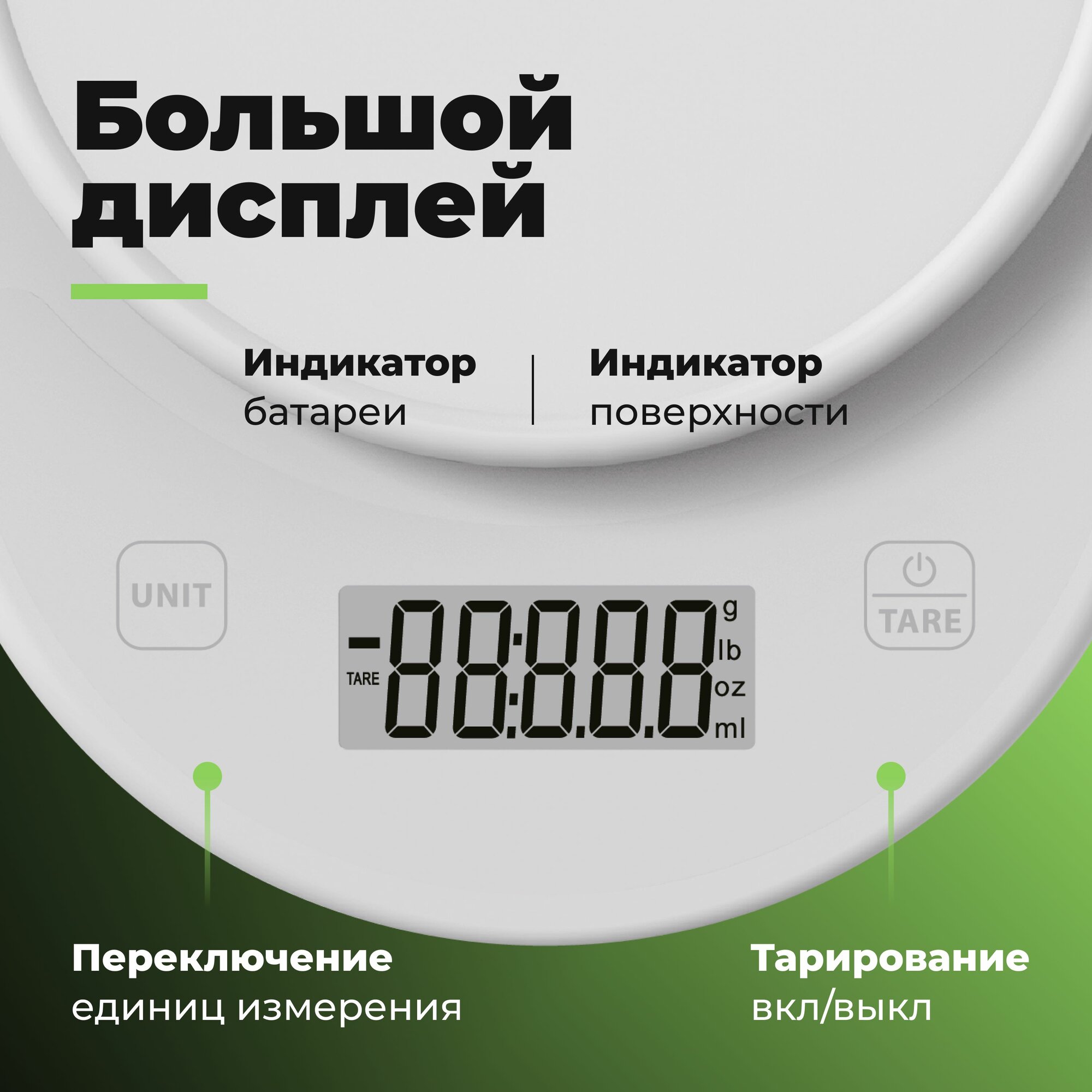 | Дополнительная информация | Большой дисплей; Выбор единиц измерения; Подсветка дисплея; Антискользящая поверхность; Компактные; Экономичные; |