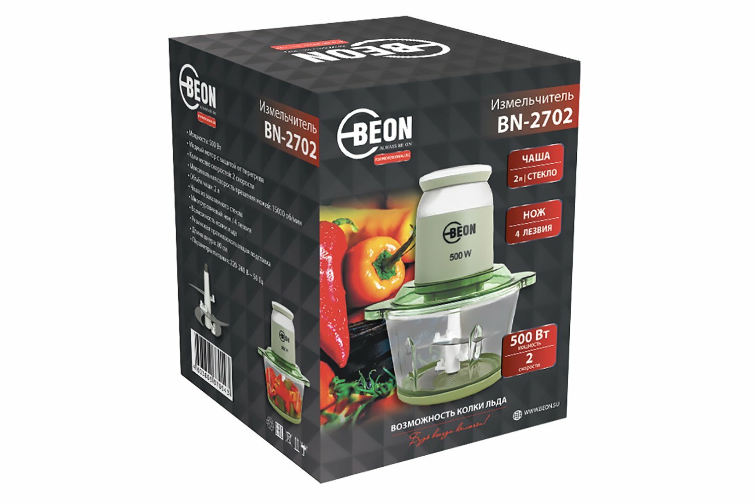 Измельчитель Beon BN-2702 (6/1) Объём чаши: 2 л , мощность: 500 Вт , чаша из Закаленного Стекла , 4 .