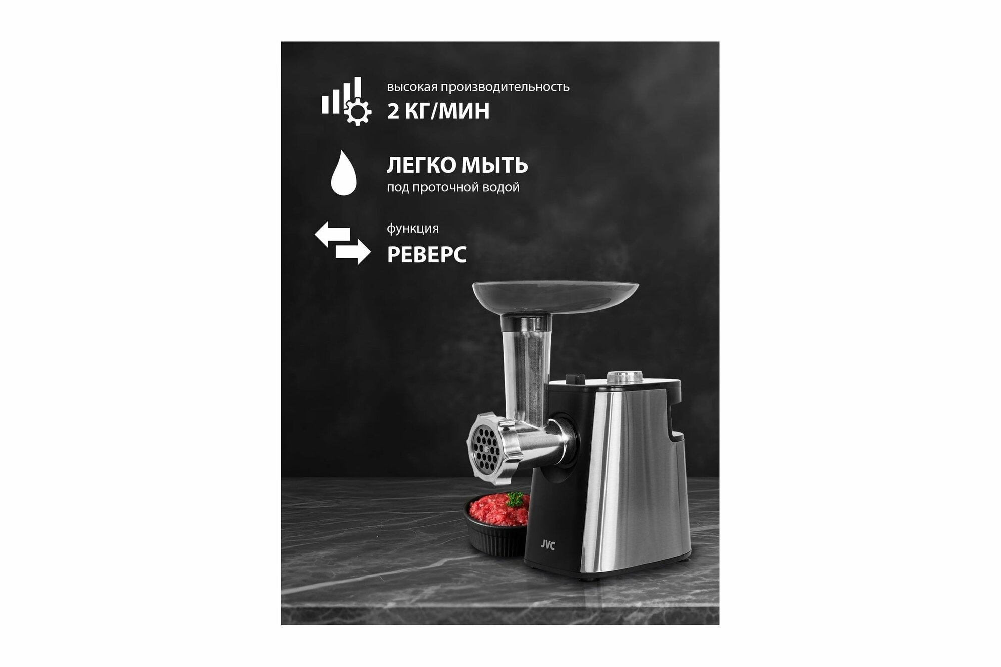 Купить Мясорубка JVC JK-MG090 с реверсом, решетки 5 и 7 мм, насадки для колбасок и кеббе, нож из нержавеющей стали, 1800 Вт