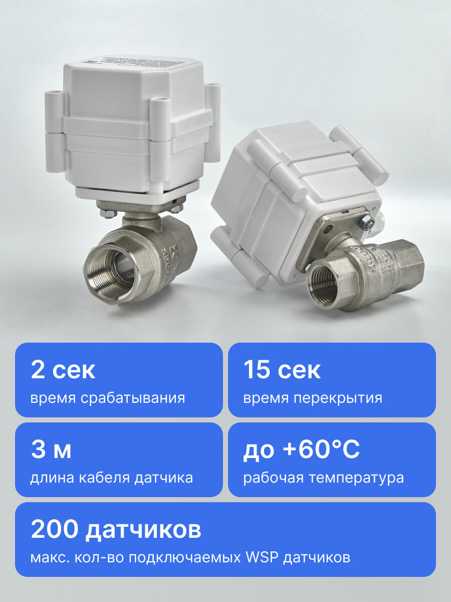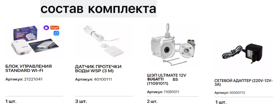 | Подробная комплектация | Блок управления STANDARD WI-FI – 1 шт, Кран шаровый Bugatti с электроприводом ULTIMATE 12V BS ½ - 2 шт, Датчик протечки воды WSP (3 м) – 3 шт., Сетевой адаптер (220V-12V-3А) – 1 шт, Паспорт-инструкция – 1 шт, Упаковочная коробка - 1 шт. |