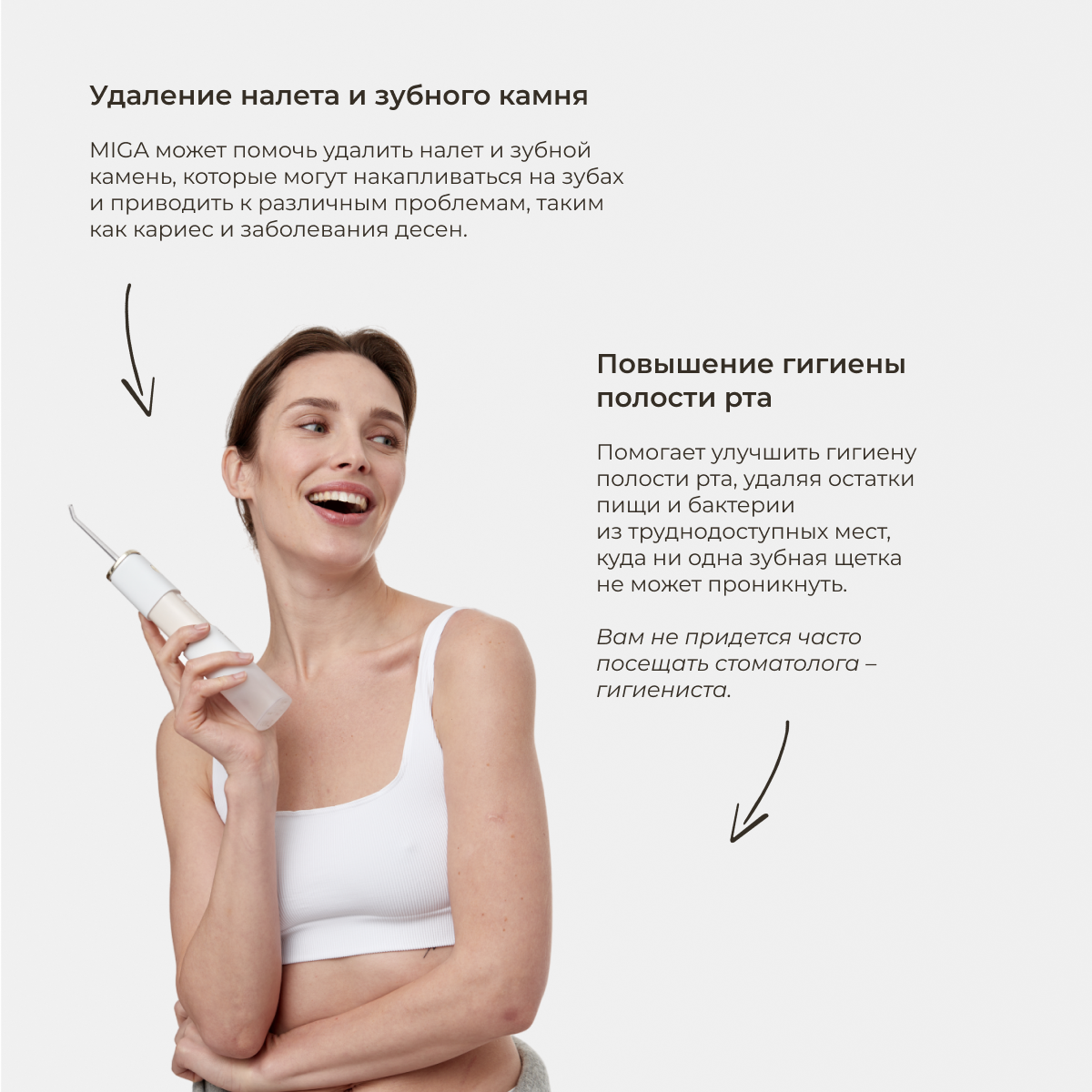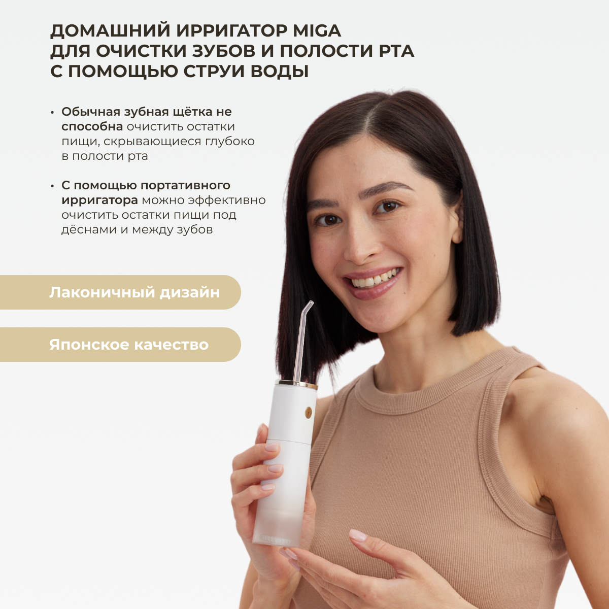 | Подробная комплектация | ортативный ирригатор для полости рта Miga, контейнер для хранения, сопло, руководство пользователя, кабель для зарядки |