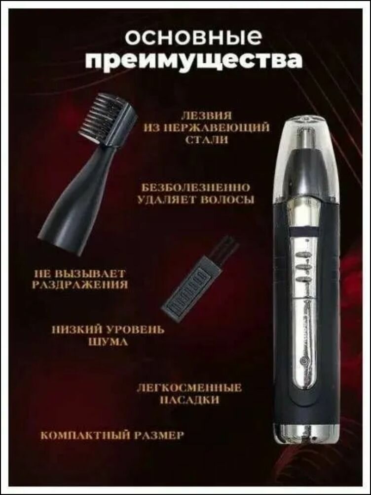 | Дополнительная информация | комплектация: насадка для носа и ушей, насадка для усов, сеточная бритва, насадка для бровей, щеточка, шнур для зарядки; уровень шума 15 дБ |