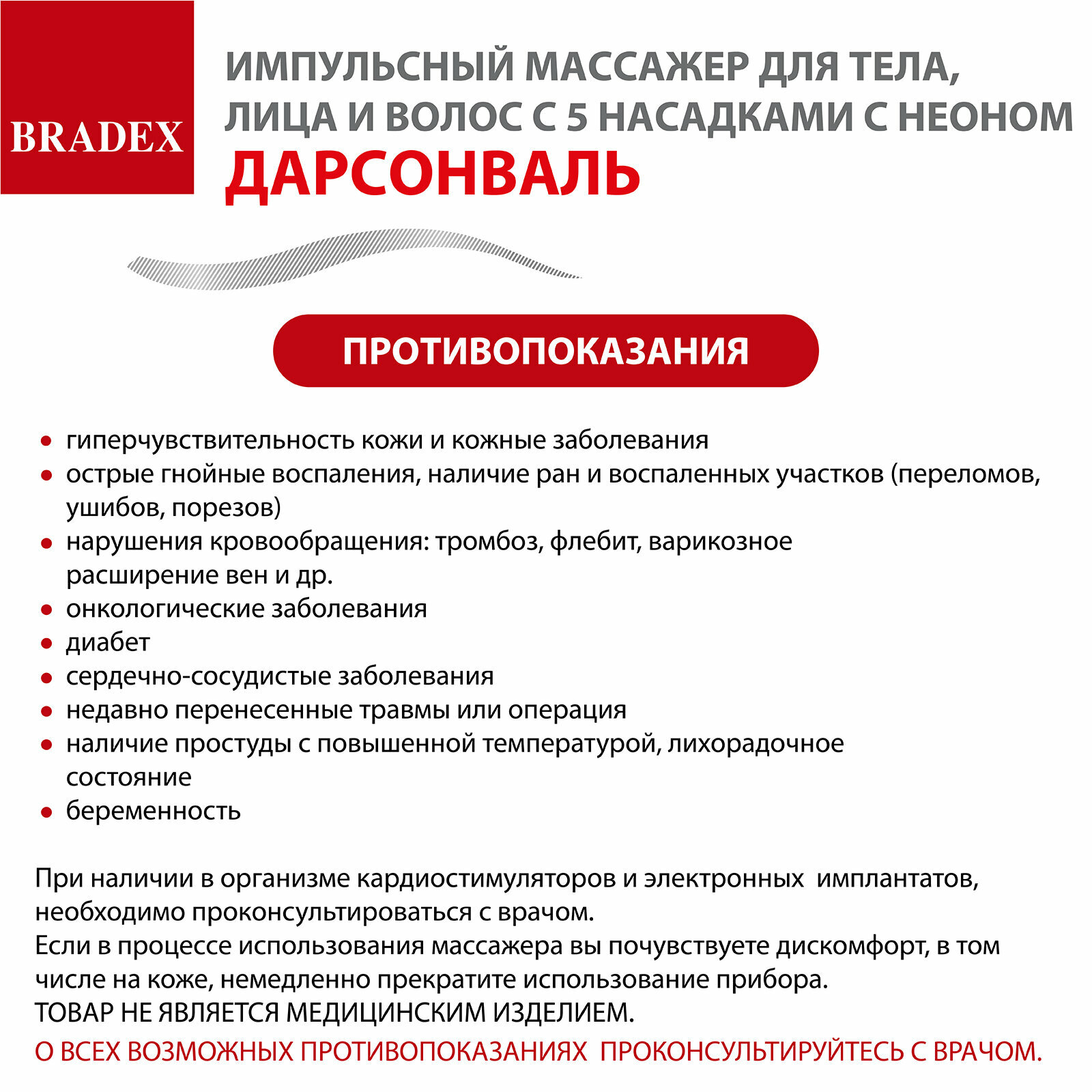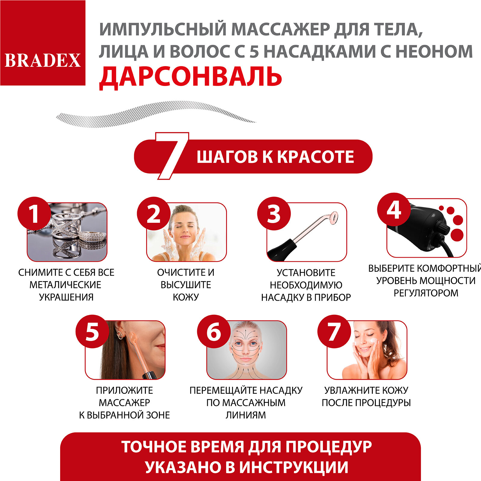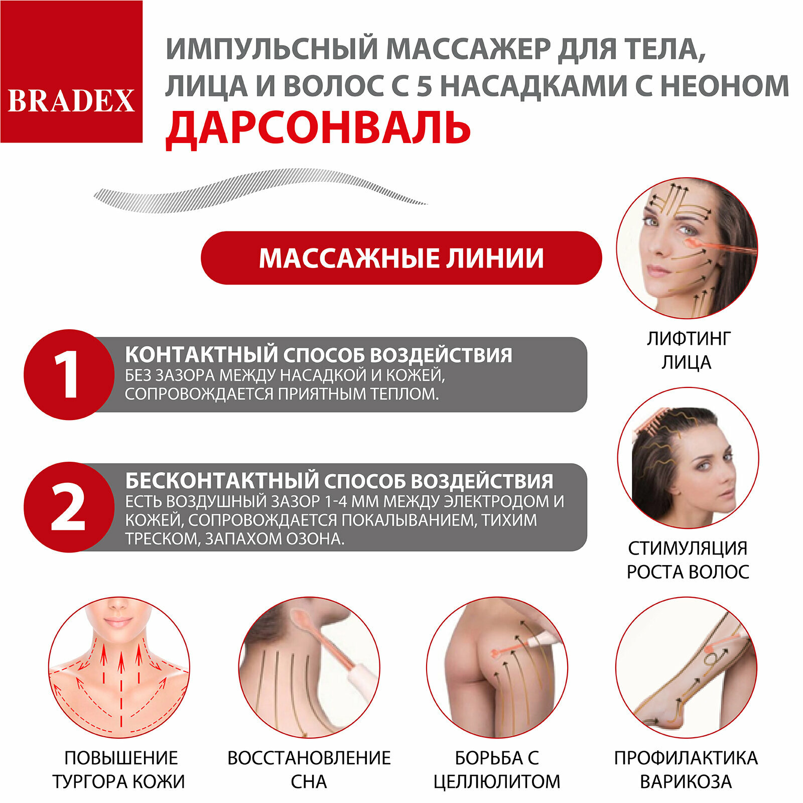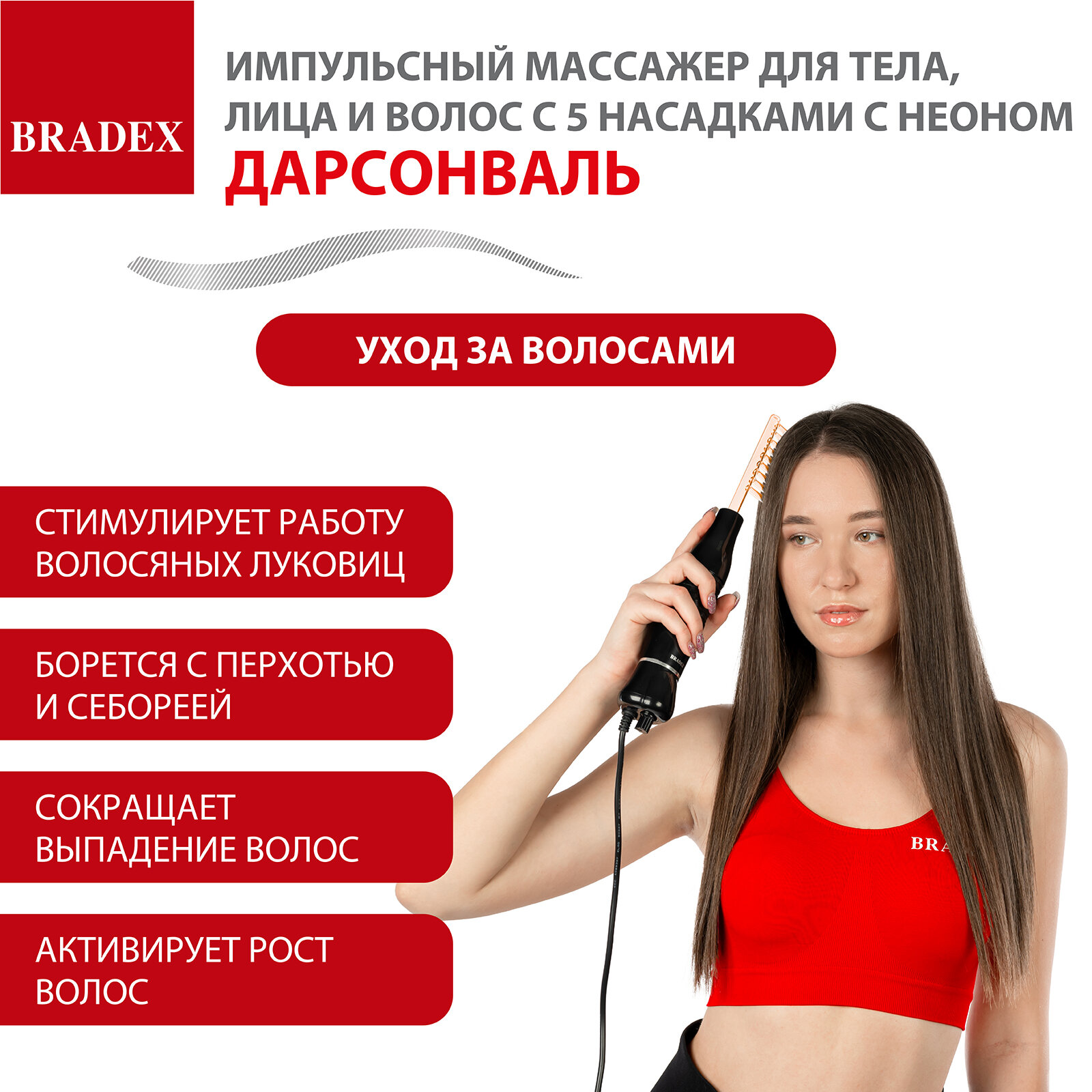 Дарсонваль импульсный массажер Bradex KZ 1175 для тела, лица и волос с 5 насадками с Неоном, черный . интересное: