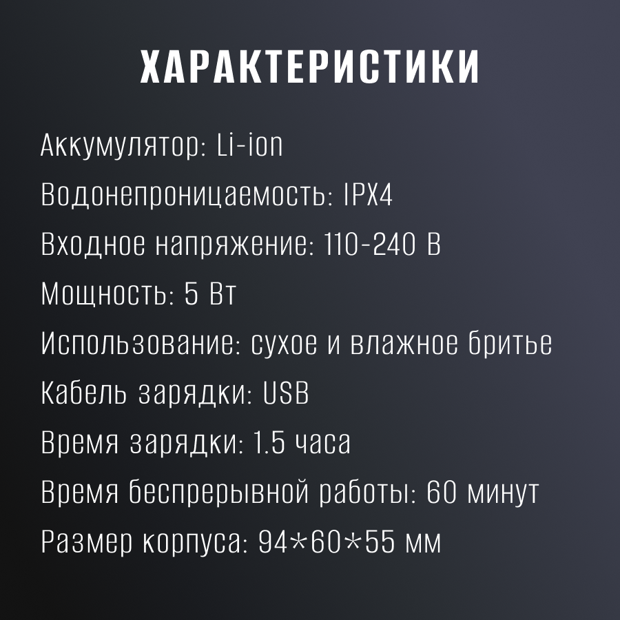 | Особенности | быстрая зарядка / для чувствительной кожи / насадка для стрижки волос / питание от USB / триммер |