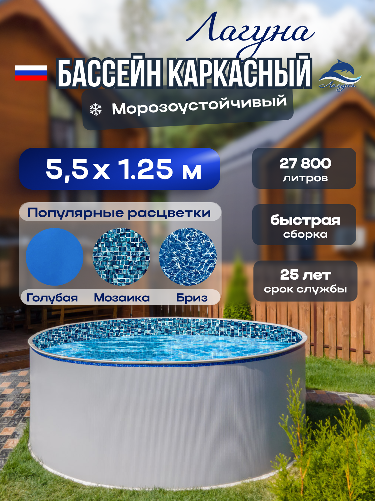 Бассейн каркасный морозоустойчивый круглый "Лагуна" 5,5 х 1,25 м, Природный камень чаша 0,6 мм