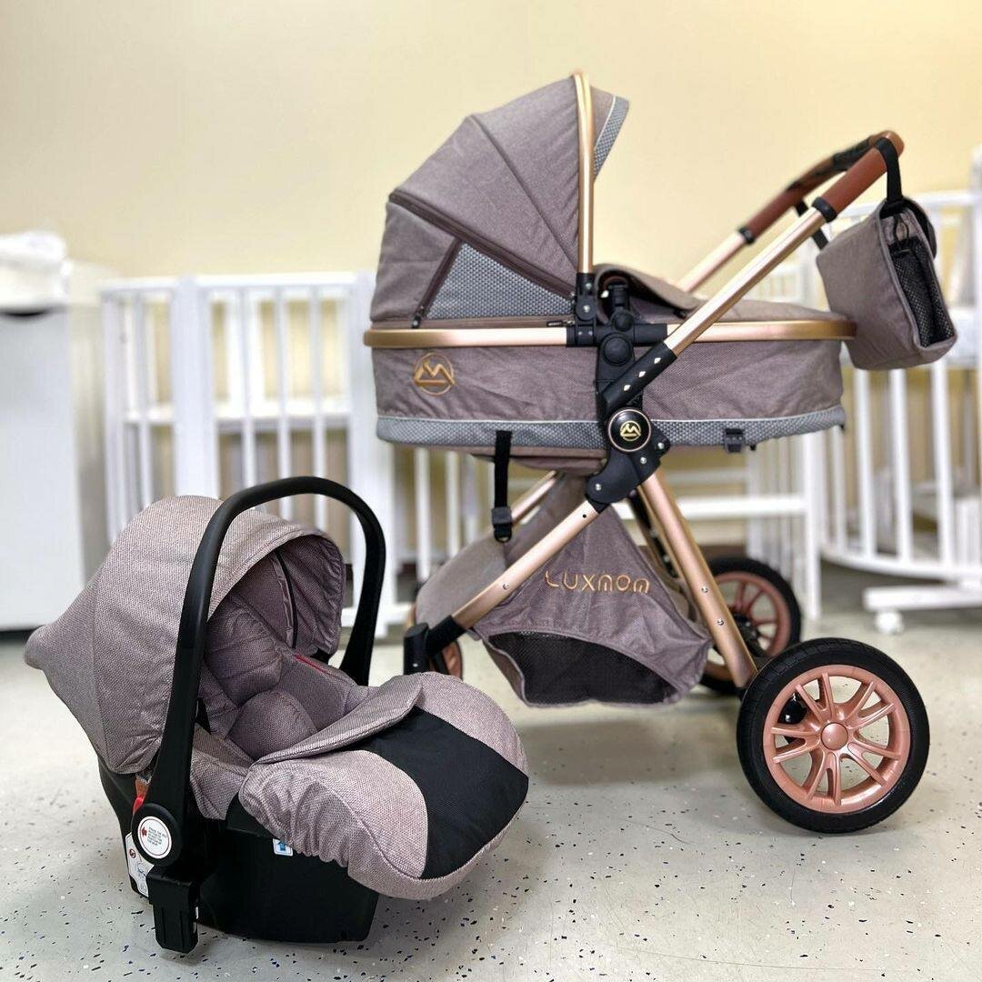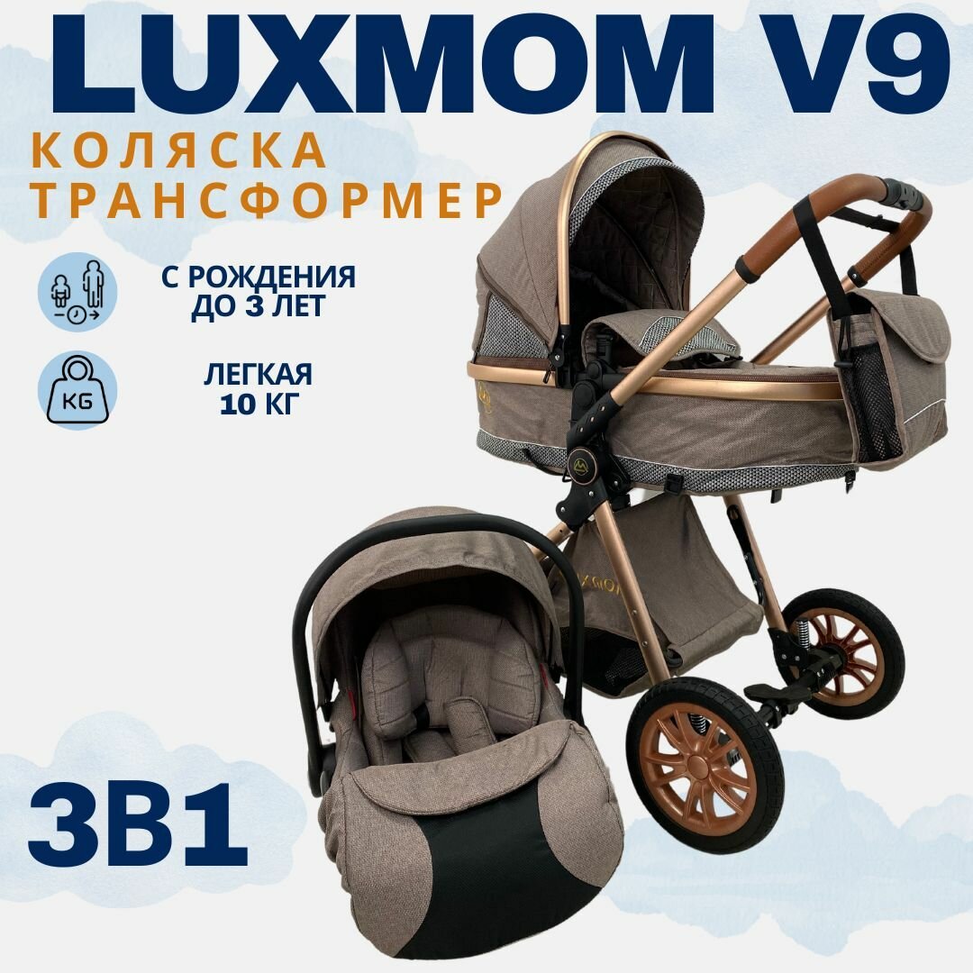 Детская коляска - трансформер Luxmom v9 3в1 коричневый, всесезонная, автолюлька