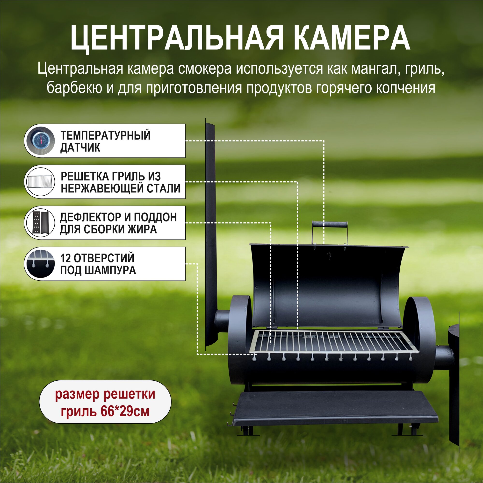 | Особенности | дровница / колёса / крышка / поддон для сбора жира / разборный / решетка / столик / термометр |