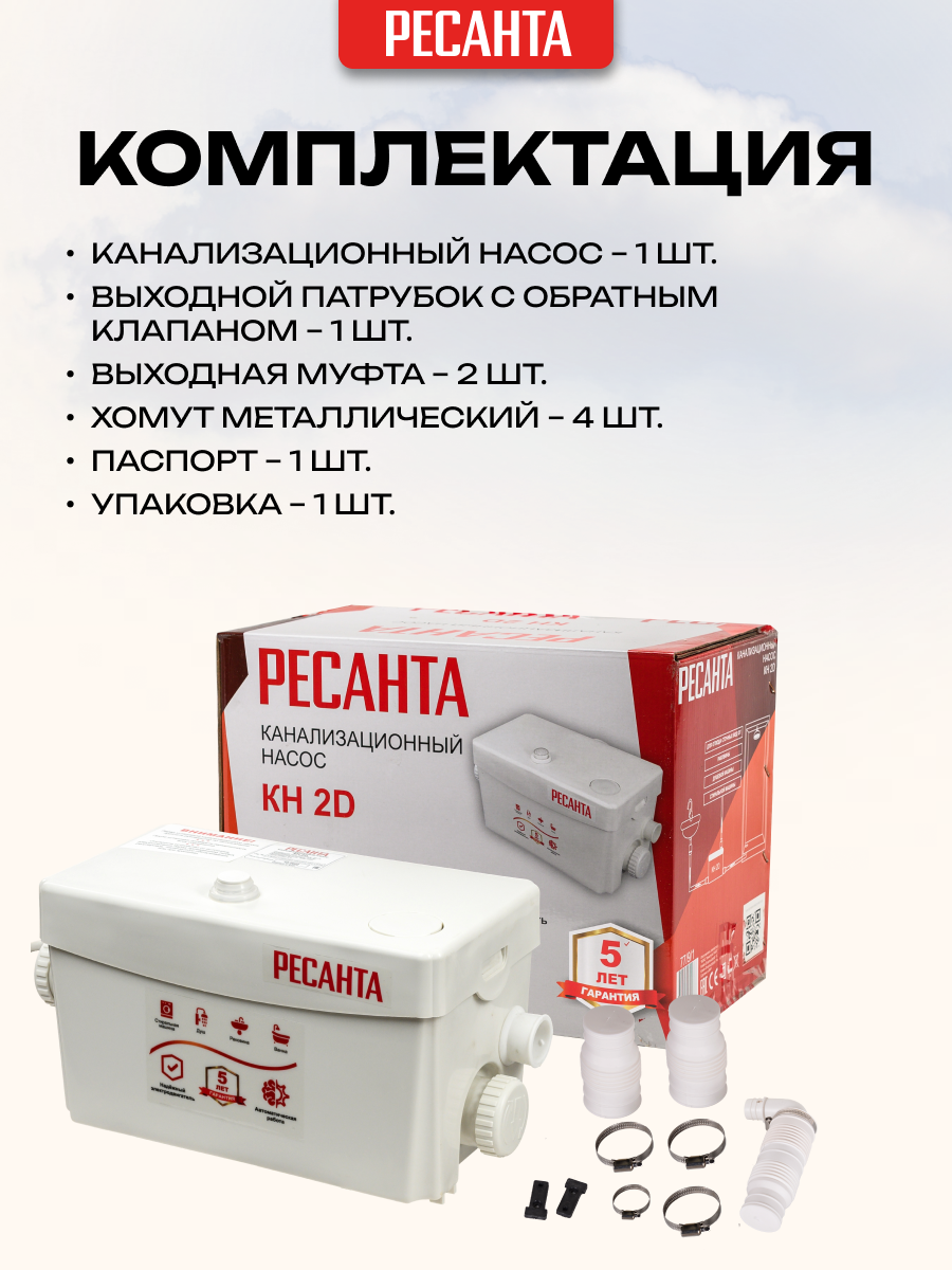 | Подробная комплектация | Канализационный насос 1 шт, выходной патрубок с обратным клапаном 1 шт, выходная муфта 2 шт, хомут металлический 4 шт |