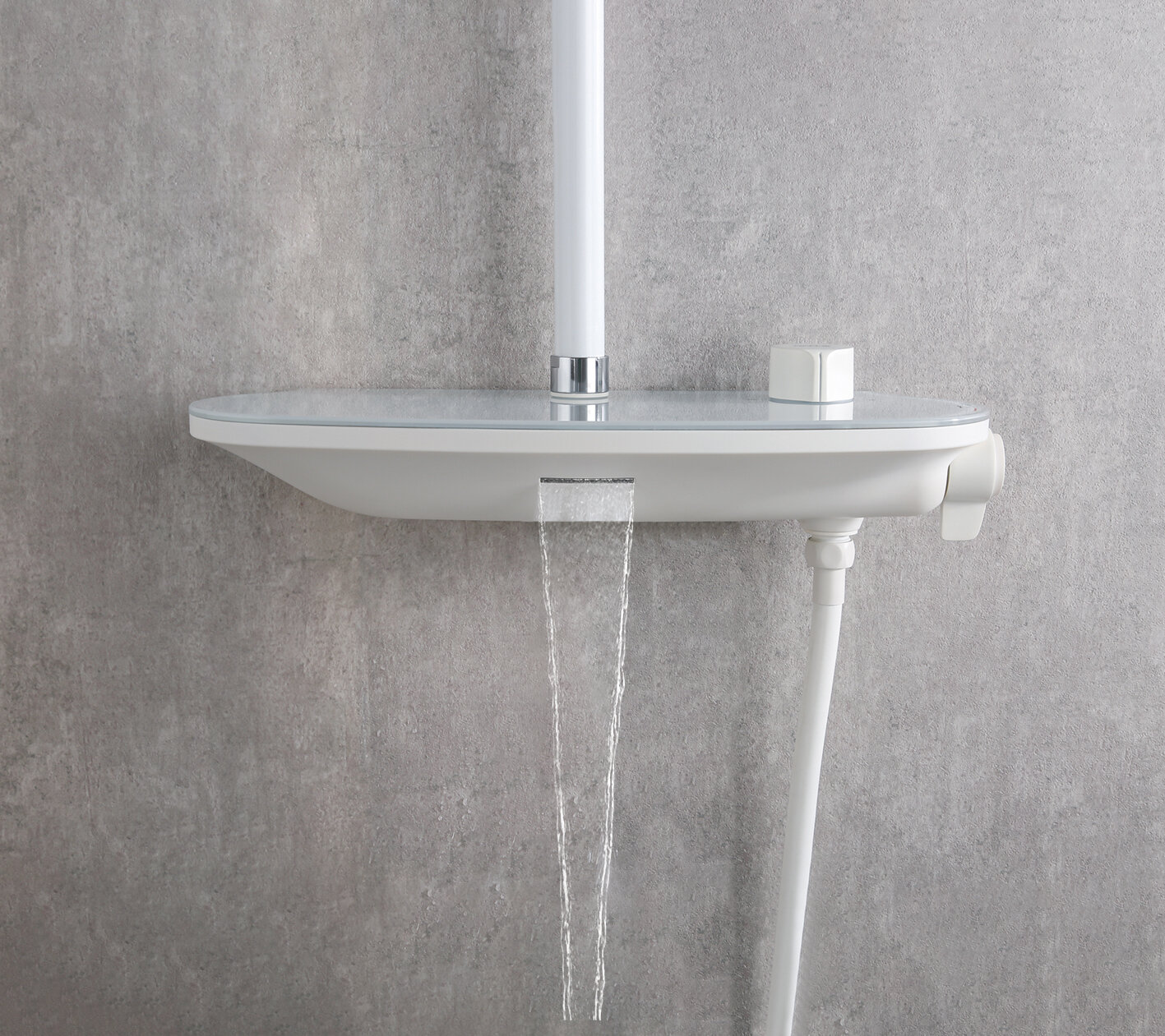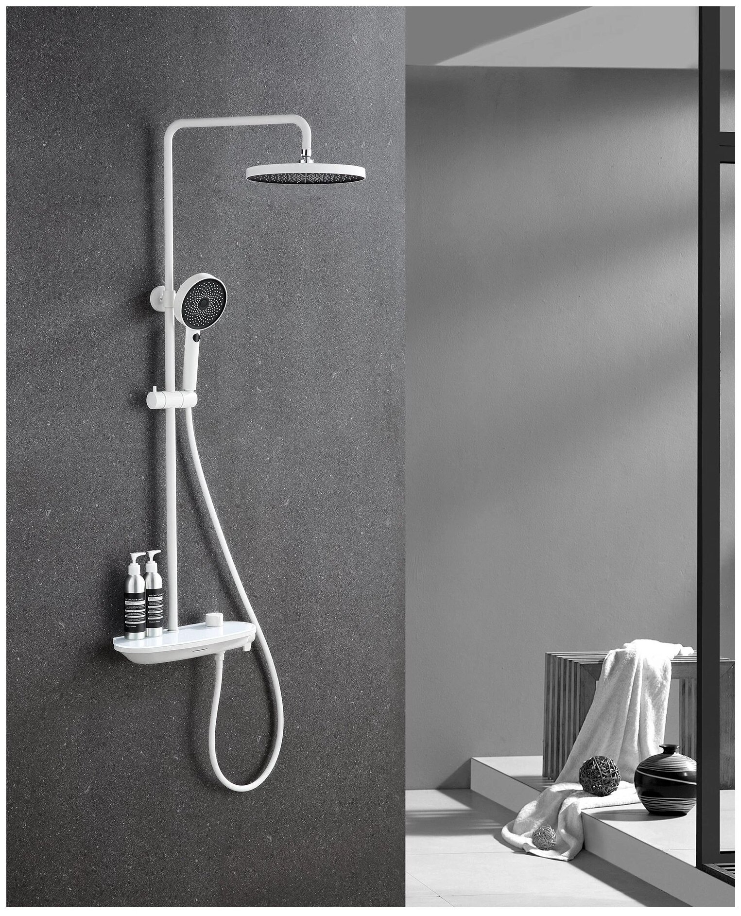 | Комплектация | верхний душ / держатель лейки / душевая стойка / излив для набора воды / лейка / набор эксцентриков / полочка / ручной душ / Смеситель / шланг |