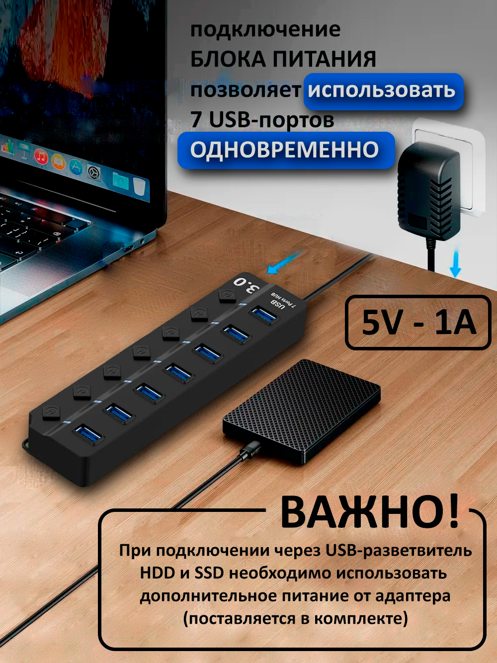 Hub USB 3.0 на 7 портов с кнопками + Блок питания 1 А в комплекте, USB разветвитель на 7 портов, USB-концентратор интересное: