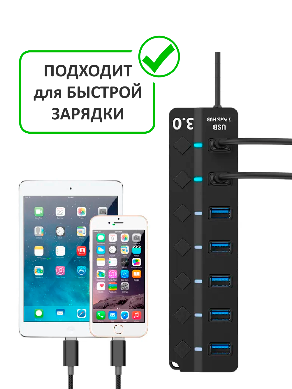 Купить Hub USB 3.0 на 7 портов с кнопками + Блок питания 1 А в комплекте, USB разветвитель на 7 портов, USB-концентратор