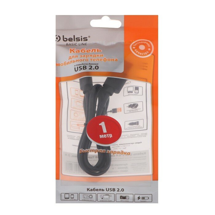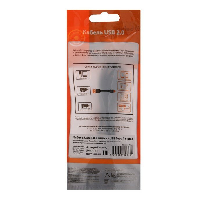Кабель BELSIS USB 2.0 А - Type C 1.8A черный 1 м BW1407B