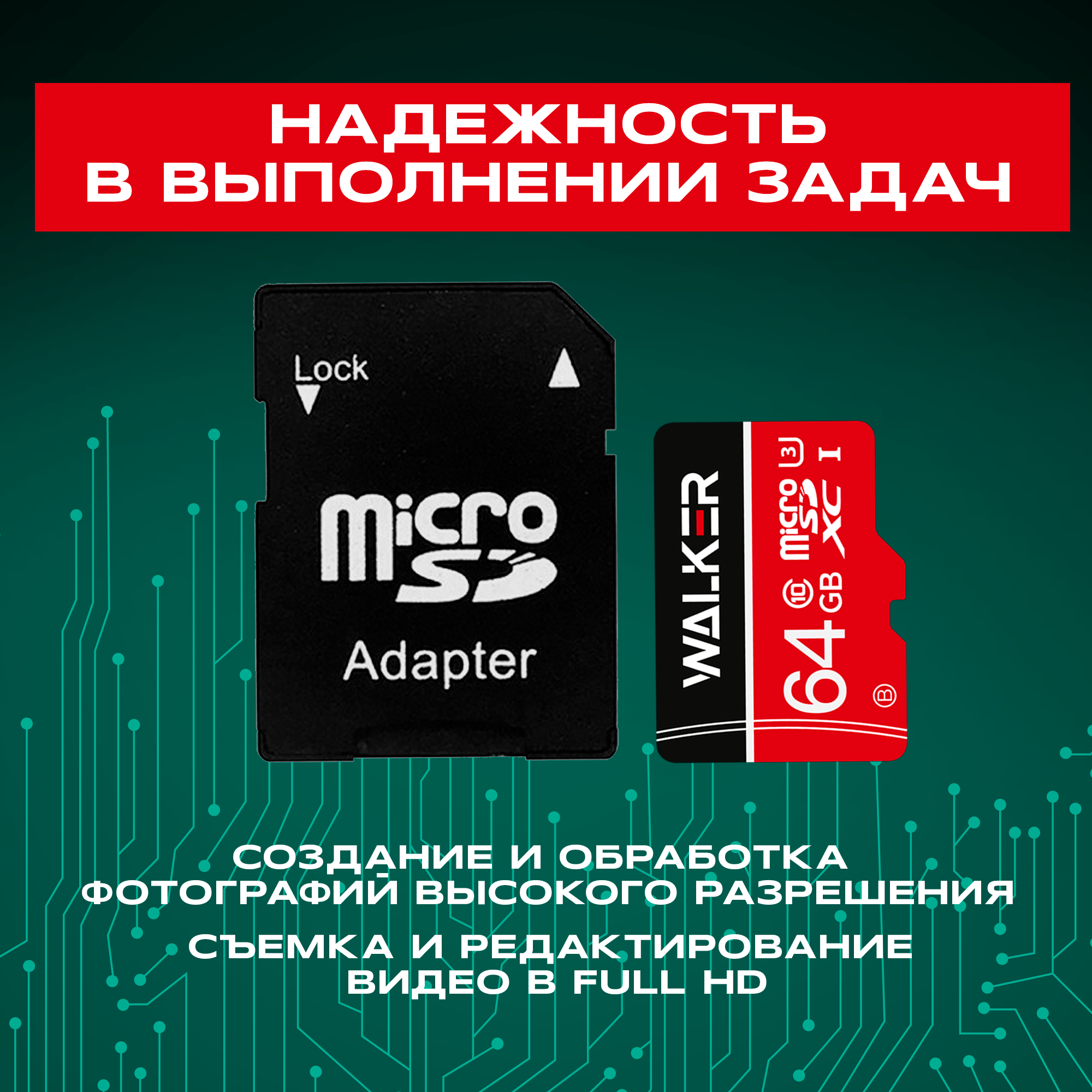 СохранитьКарта памяти 64 гб, WALKER, с адаптером // карта памяти, microsd, микро сд карта, micro sd, sd card, сд карта, sd карта, черная интересное: