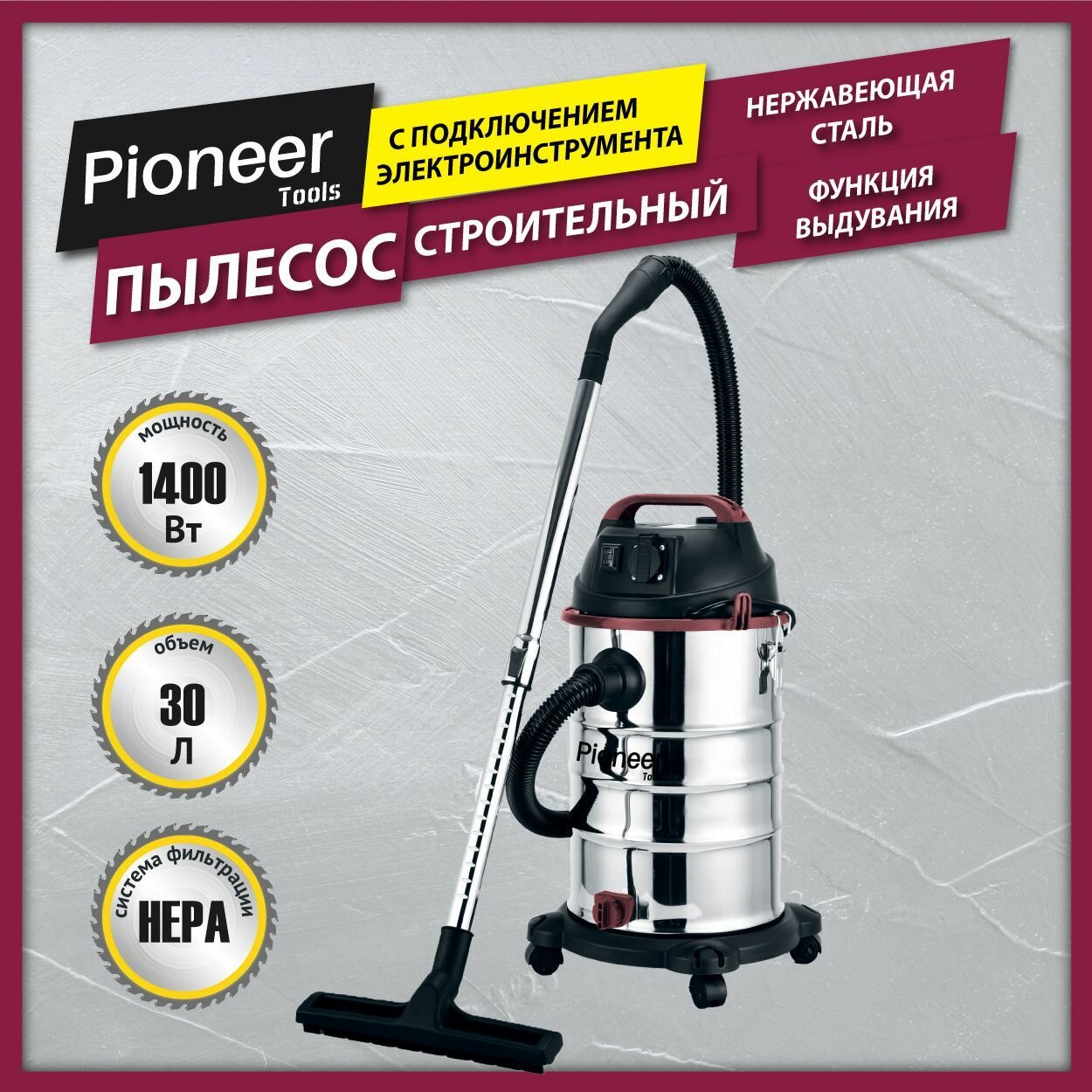 Пылесос строительный Pioneer 30 л с нера-фильтром, функция выдувания, синхронизация работы с инструментом, сбор жидкости, 1400 Вт