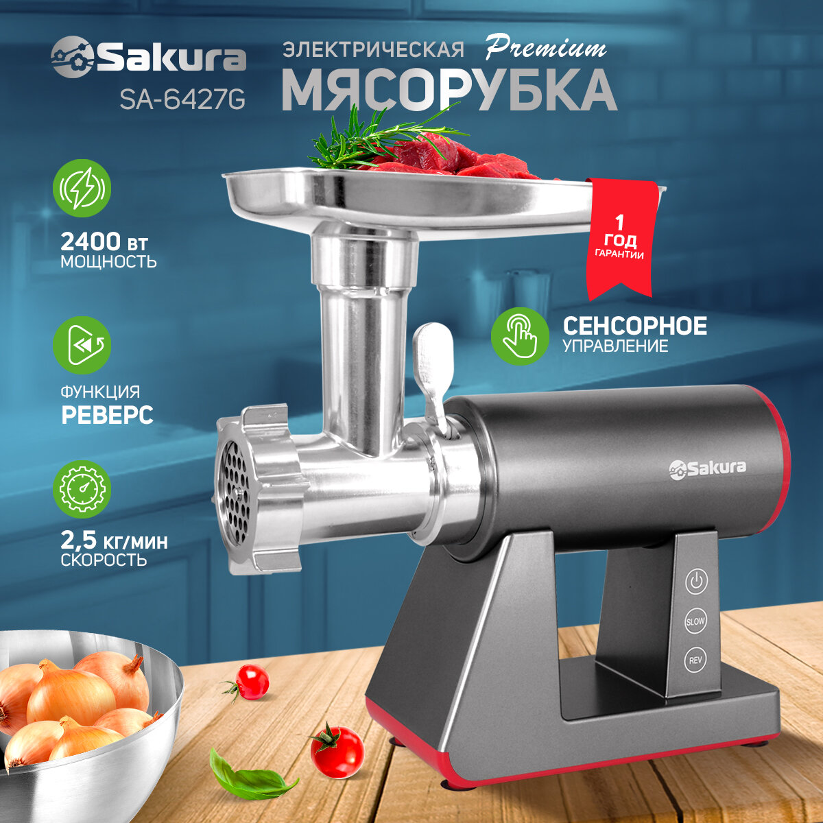 Купить Мясорубка Sakura SA-6427G Premium 2400Вт, реверс, 2 скорости, комплект насадок