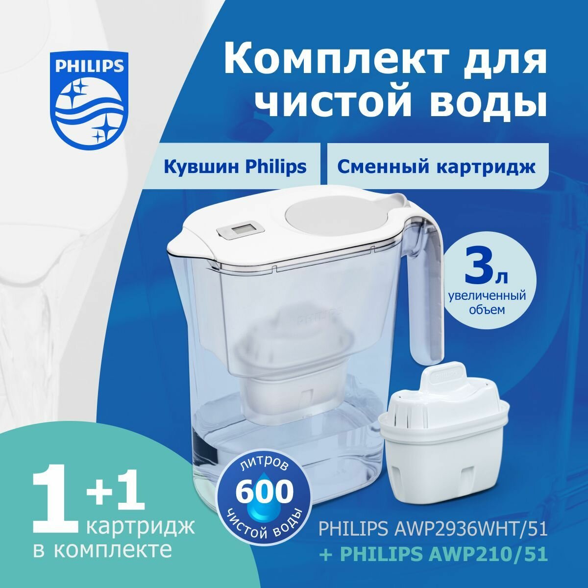 Комплект кувшин Philips AWP2936WHT/51, 3 литра, цифровой таймер + сменный картридж Philips AWP210/51, 1 шт