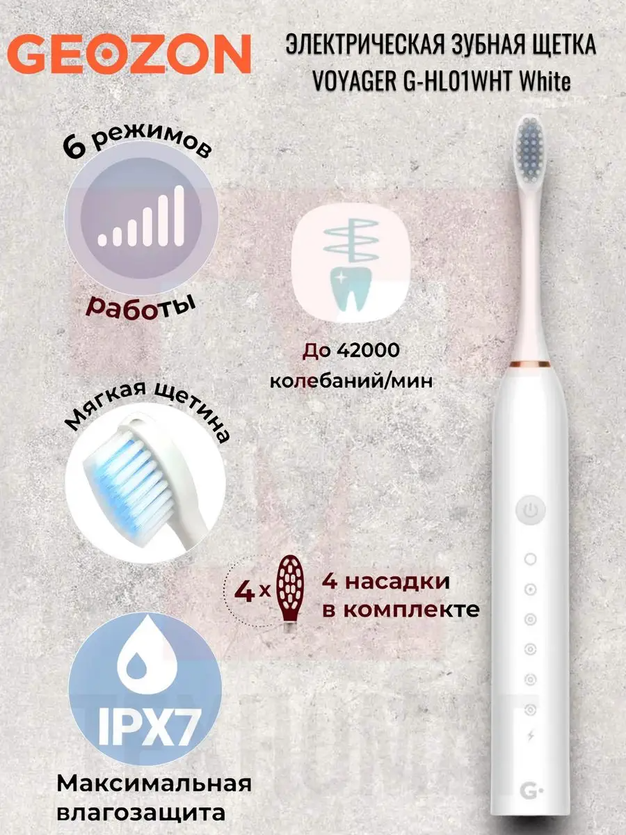 | Подробная комплектация | Электрическая зубная щетка GEOZON VOYAGER, Сменные насадки (4 шт), Зарядный кабель, Инструкция пользователя |
