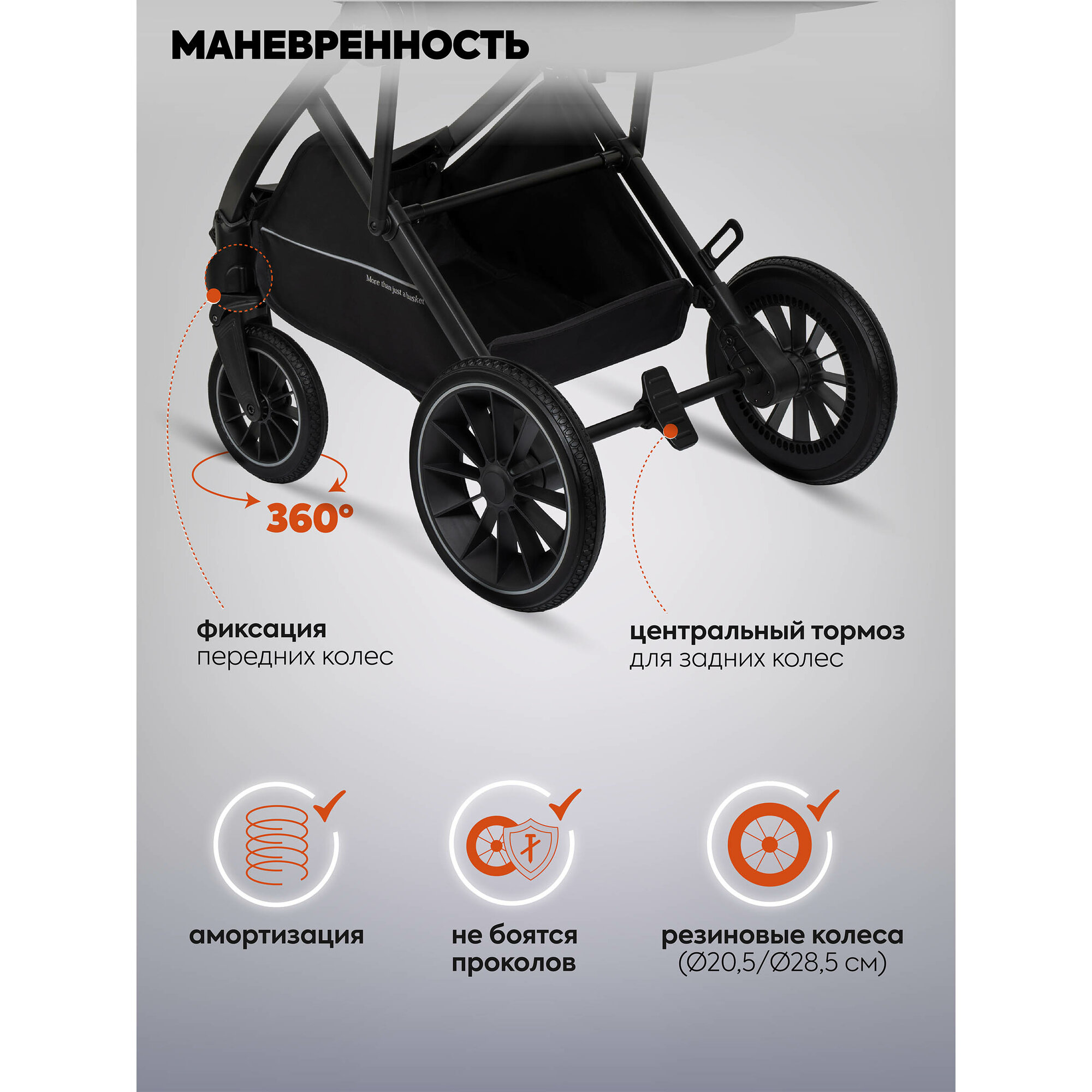 | Особенности шасси | корзина для покупок / перестановка блока лицом/спиной / регулировка высоты ручки |