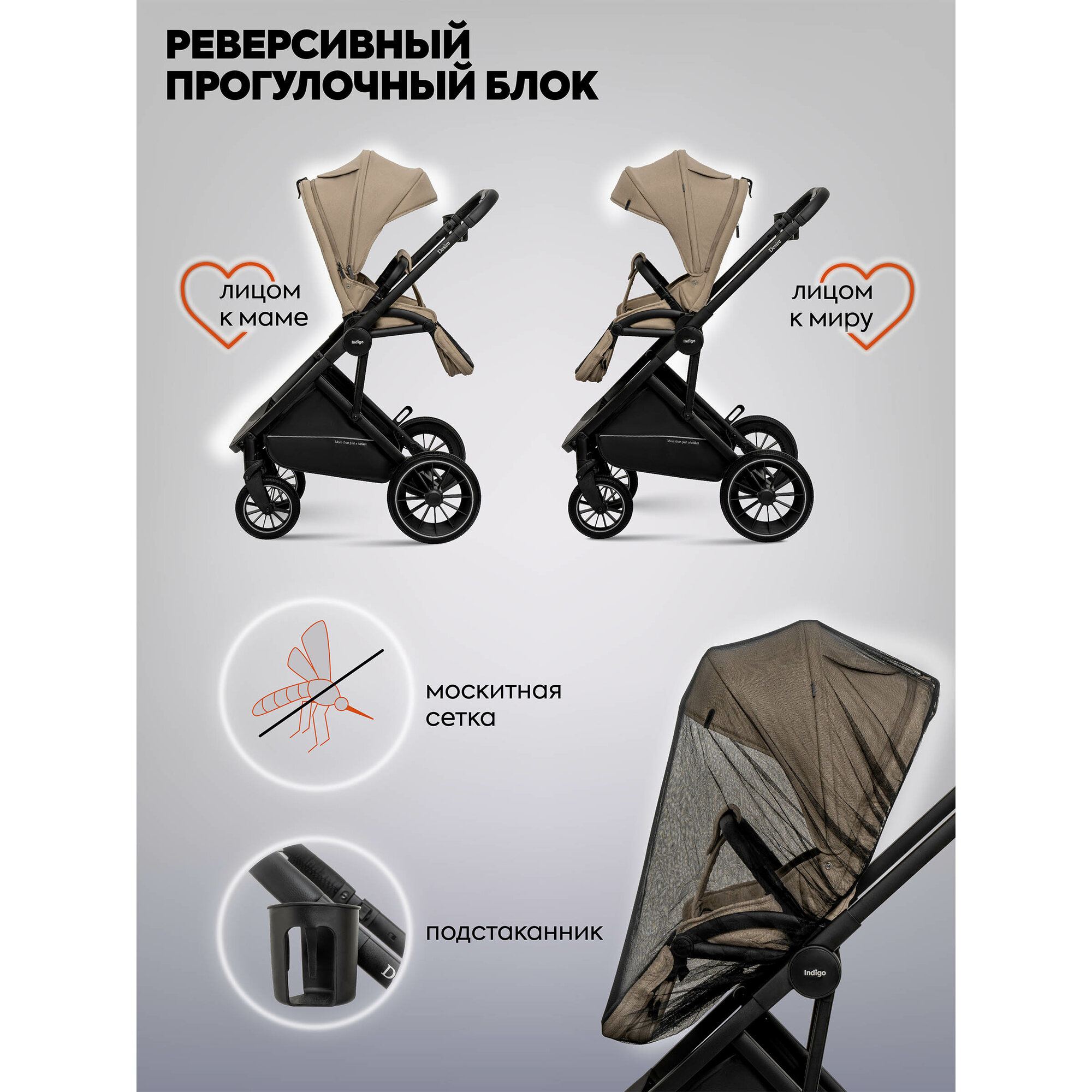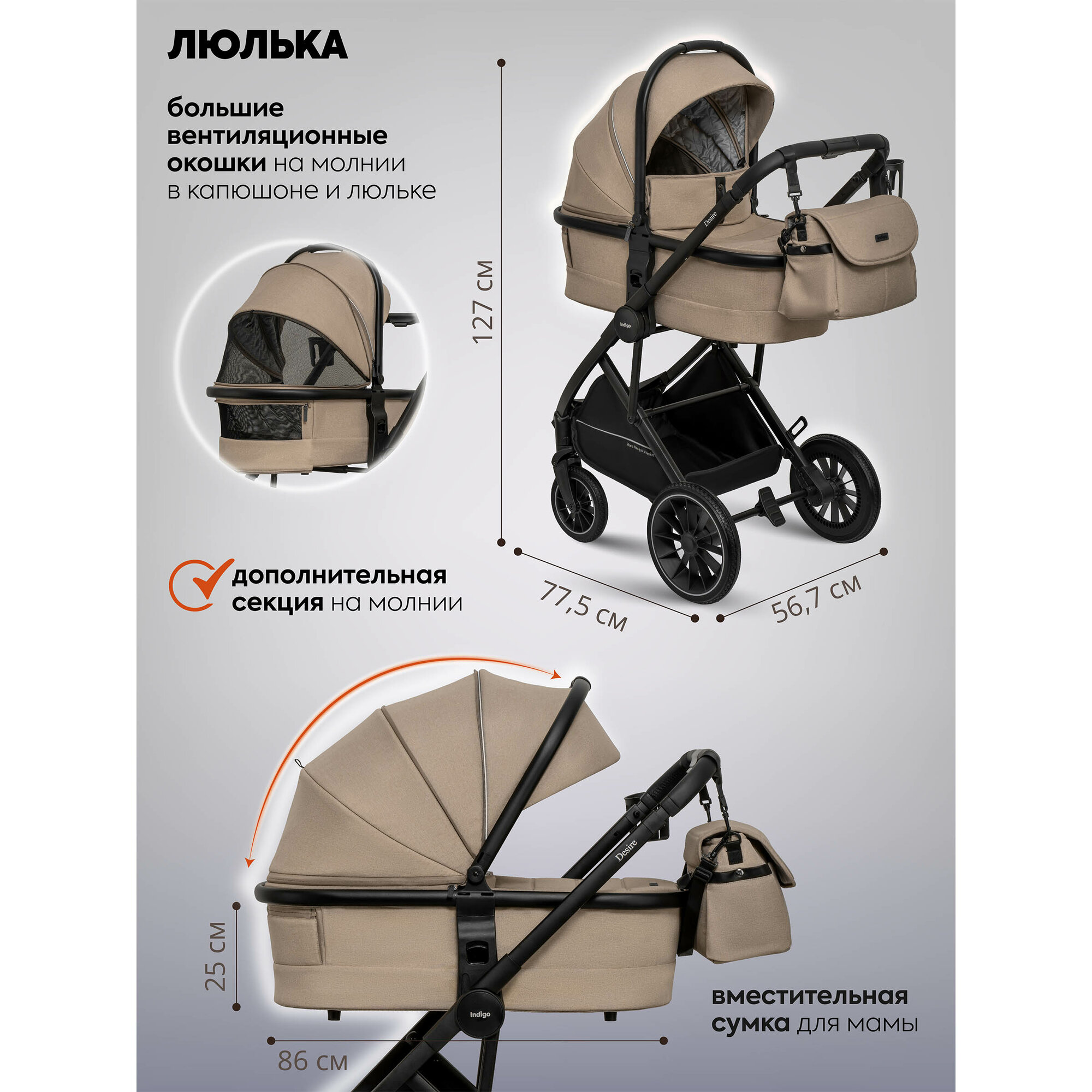 Коляска люлька универсальная INDIGO DESIRE 3в1 прогулочная всесезонная, бежевый