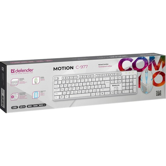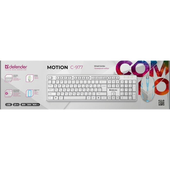 Проводной набор Клавиатура + Мышь DEFENDER Motion C-977 RU, полноразмерный,1.8м, белый