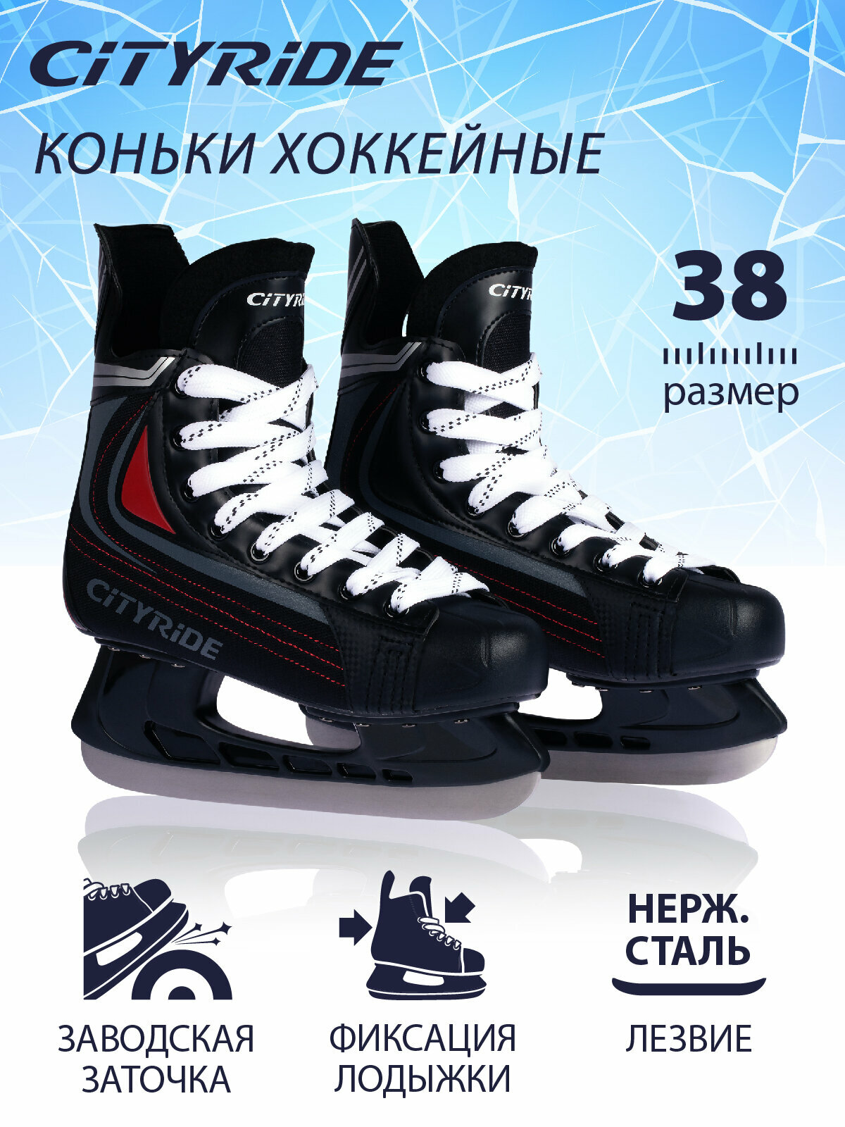 Хоккейные коньки ТМ City-Ride, лезвия нержавеющая сталь/заводская заточка, ботинки нейлон/ПВХ, чёрный/красный, 38