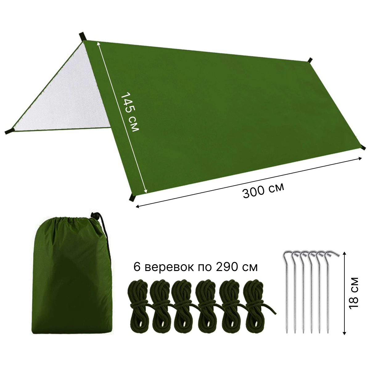| Подробная комплектация | Тент-1 шт, веревка -6 шт, колышки -6 шт, чехол -1 шт |