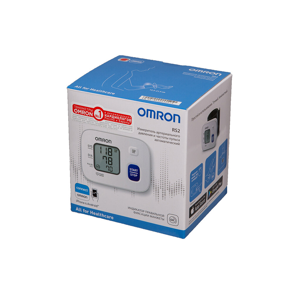 | Комплектация | Электронный блок тонометра Omron RS2 (HEM 6121-RU),Физиологическая манжета 13,5 - 21,5 см,Руководство по эксплуатации,Футляр для хранения прибора,Комплект элементов питания,Гарантийный талон |
