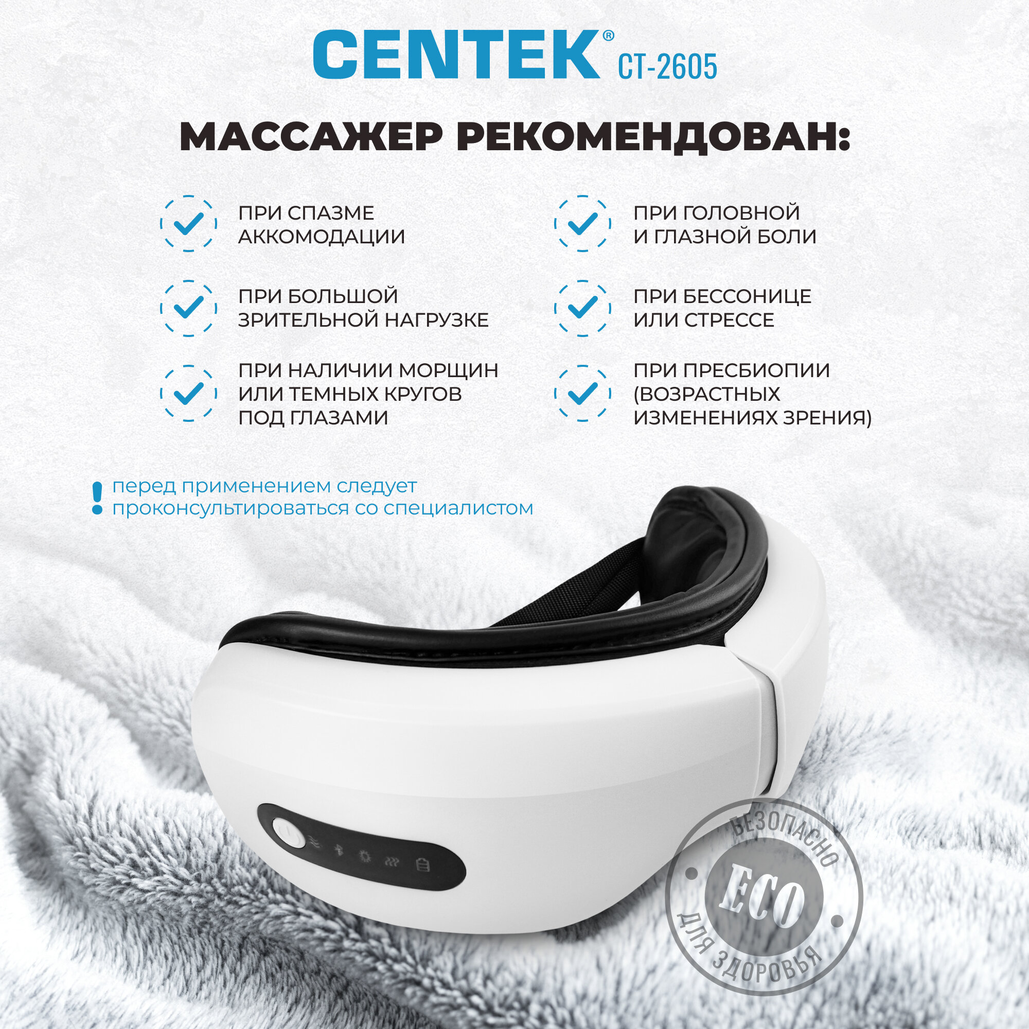 Купить Массажер для глаз CENTEK CT-2605 - 7 Вт/ 4 режима/ аэромассаж/ вибрация/ тепловая терапия/ воспроизведение музыки